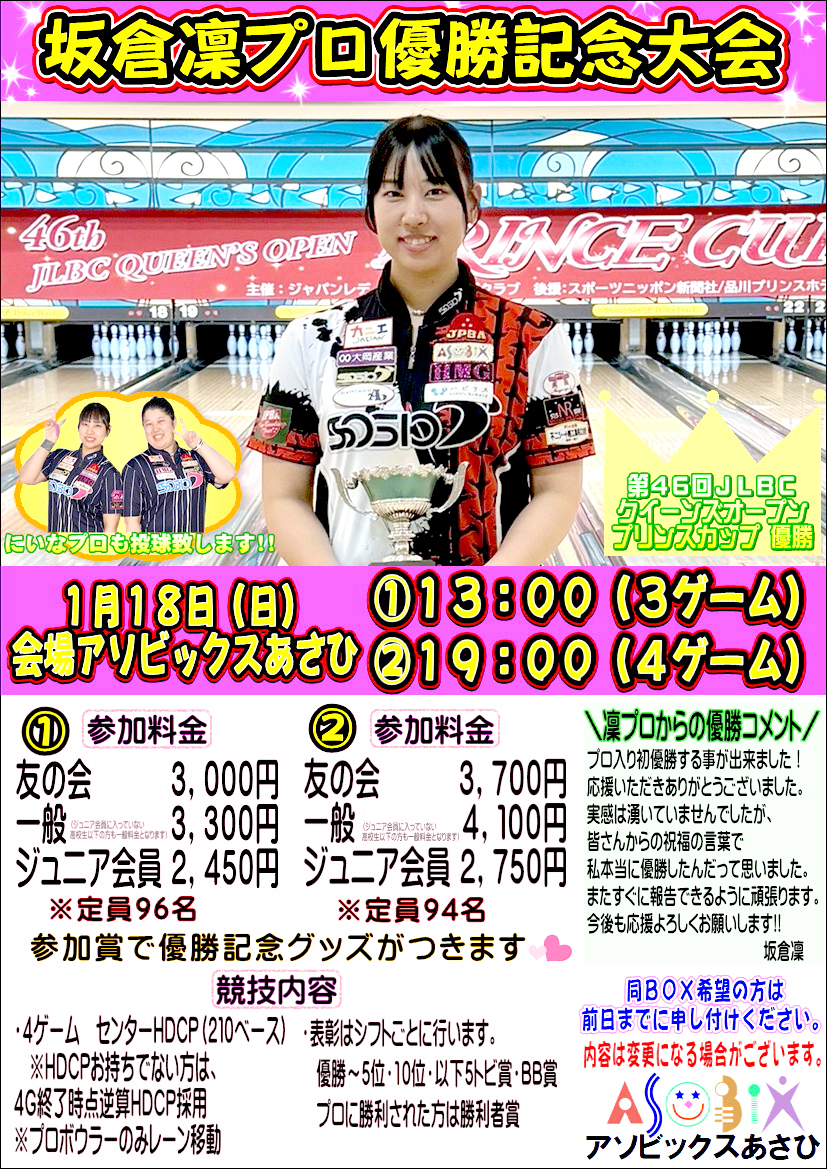- 26/01/10 プロボウラー坂倉凜プロの初優勝記念大会 18日 アソビックスあさひ 朝日町のアソビックスあさひ所属の姉妹プロボウラー坂倉凜プロの初優勝を記念した大会が18日13時と19時の2回、同所で開 …