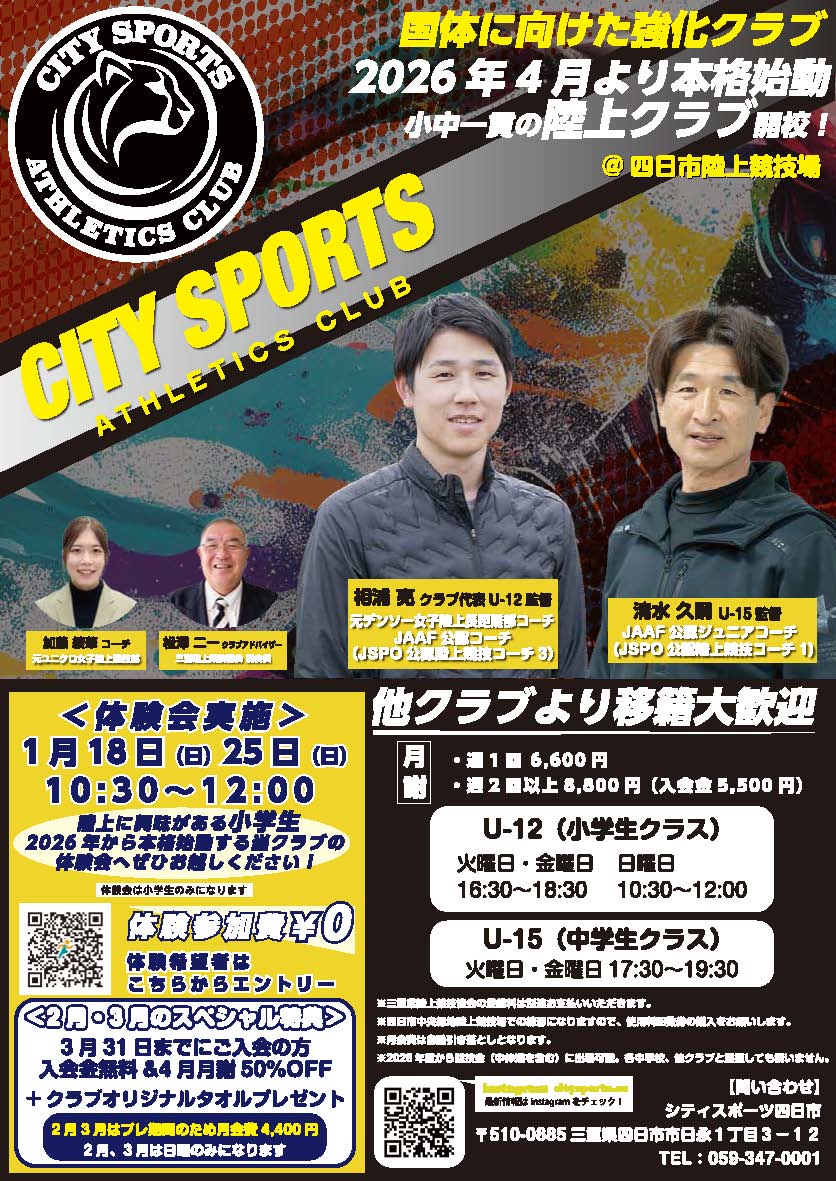 - 26/01/10 陸上競技の体験会を実施 18、25日 四日市中央緑地運動施設 シティスポーツアスレチッククラブ 四日市市のシティスポーツアスレチッククラブが18、25の両日10時30分から四日市中央緑地運動施設で、小学生を対象とし …