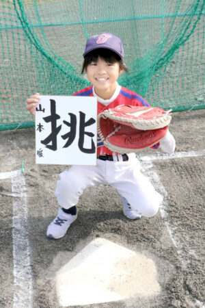 挑=私はソフトボールチーム東員SBSで、これまでサードを守っていました。6年生が抜け、新チームとなってからはキャッチャーに挑戦しています。キャッチャーはピッチャーの球を受けるだけではなく、チームに指示を出さなくてはいけません。大変ですがキャプテンとしても皆を引っ張っていけるよう、何事にもどんどん挑んでいき、一回りも二回りも成長できるように頑張りたいと思います。