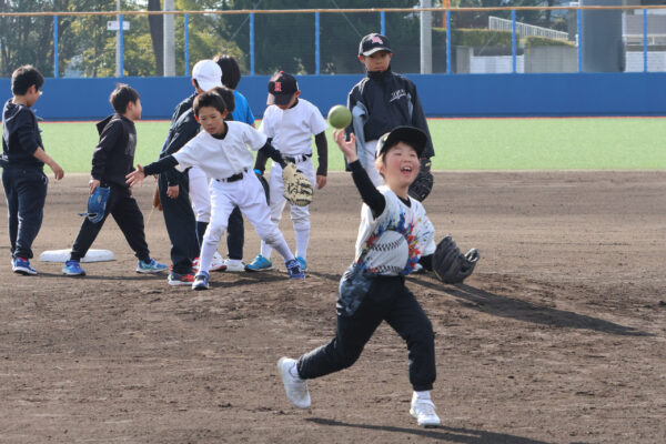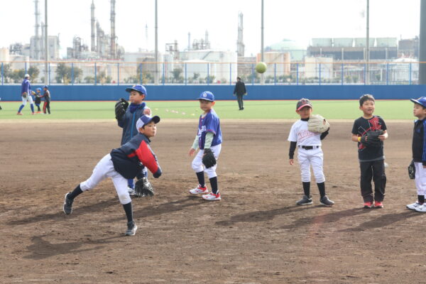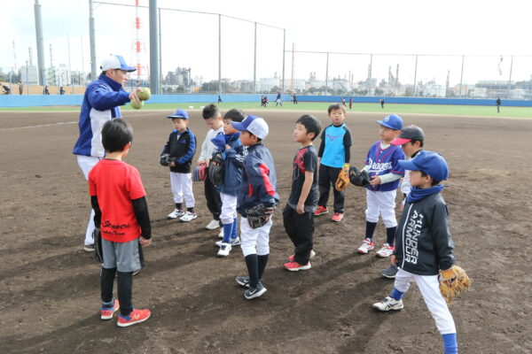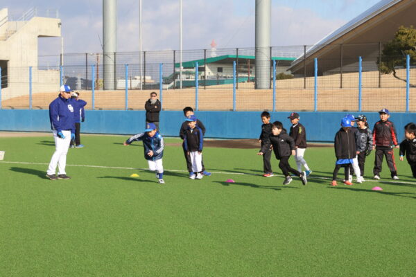 低学年で初心者向けのキッズに約30人、高学年で経験者向けのジュニアに約40人が参加。中日ドラゴンズOBの山北茂利さん、丸山泰資さん、関啓扶さん、元広島の酒井大輔さんが指導しました。