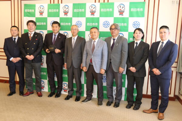 写真は市役所を表敬訪問した中日ドラゴンズの吉川社長、アカデミーの関係者、四日市市スポーツ協会の皆さん