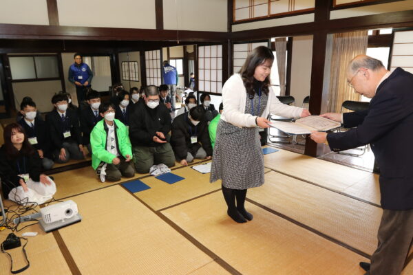 贈呈式は同校であり、山口会長から一人一人に感謝状と参加したイベント名が書かれて活動証明書が手渡されました。