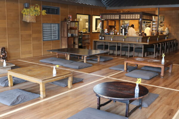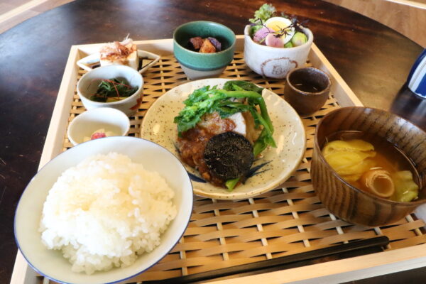 食事処の新上木食堂は約8年、阿下喜商店街で営んできた上木食堂が移転したもの。藤原岳麓の自社農園で栽培した無肥料、無農薬の野菜を中心にした料理を提供。ランチは肉か魚を主食にしたもの、地元の粉を使ったそばなどがあります。営業時間は午前11時~午後10時。定休日は第2・4火曜。