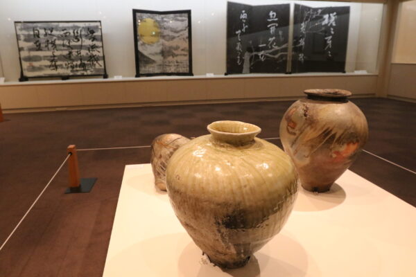 細川さんが手掛けた襖(ふすま)絵、障壁画の下絵、陶芸、水墨画、油絵、昨年、京都の南禅寺に寄贈した襖絵『赤壁舟遊図』など101点を展示しています。