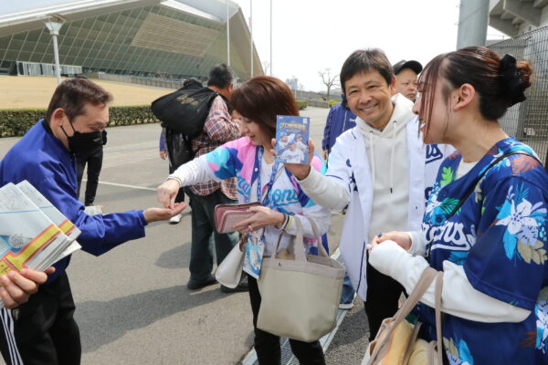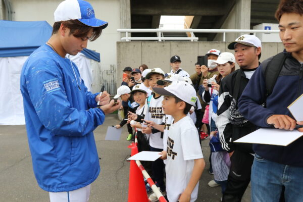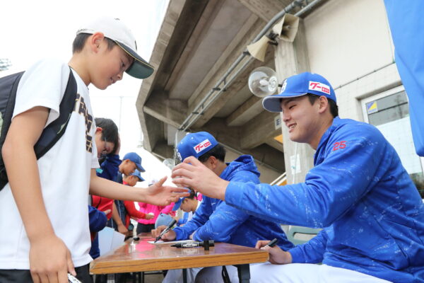 写真はサインに応じる選手、応援する子どもたち、中スポやガイドブックの販売の様子