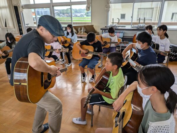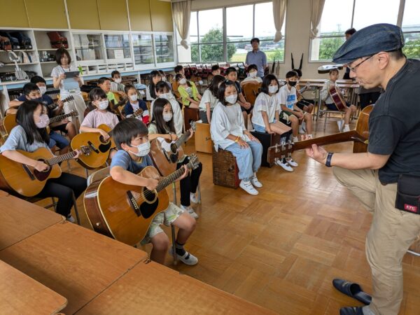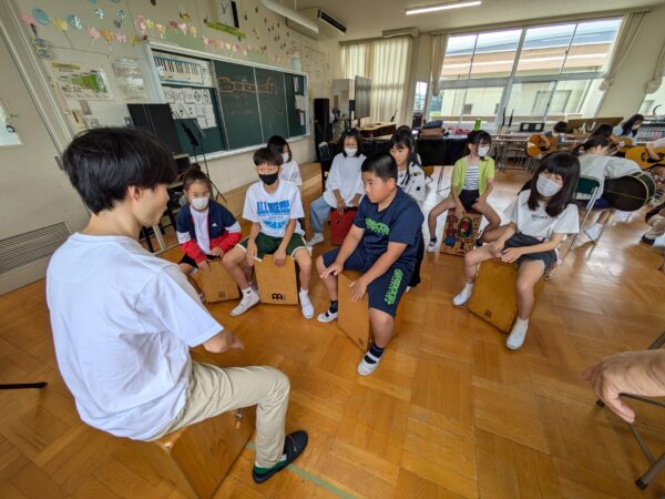 東員町の三和小学校で3日、5年生28人がフォークギターや箱型の打楽器カホンの演奏体験に取り組みました。