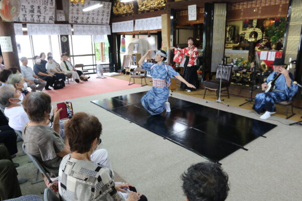 寺で演奏や踊りを楽しむ『お盆の集い』が7日、四日市市水沢の一乗寺(市橋愛爾住職)でありました。集まった檀家(だんか)や住民約60人が地元の『水沢音頭』、三味線演奏、フラメンコの舞台を楽しみました。