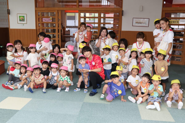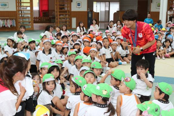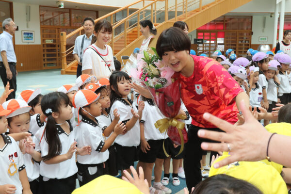 パリ五輪のレスリング53㌔級の金メダリスト藤波朱理選手=四日市市北山町出身=が3日、卒園した同市のエンゼル幼稚園を訪問。メダルを見せたり、レスリングの基本を教えたりし、園児らと交流しました。