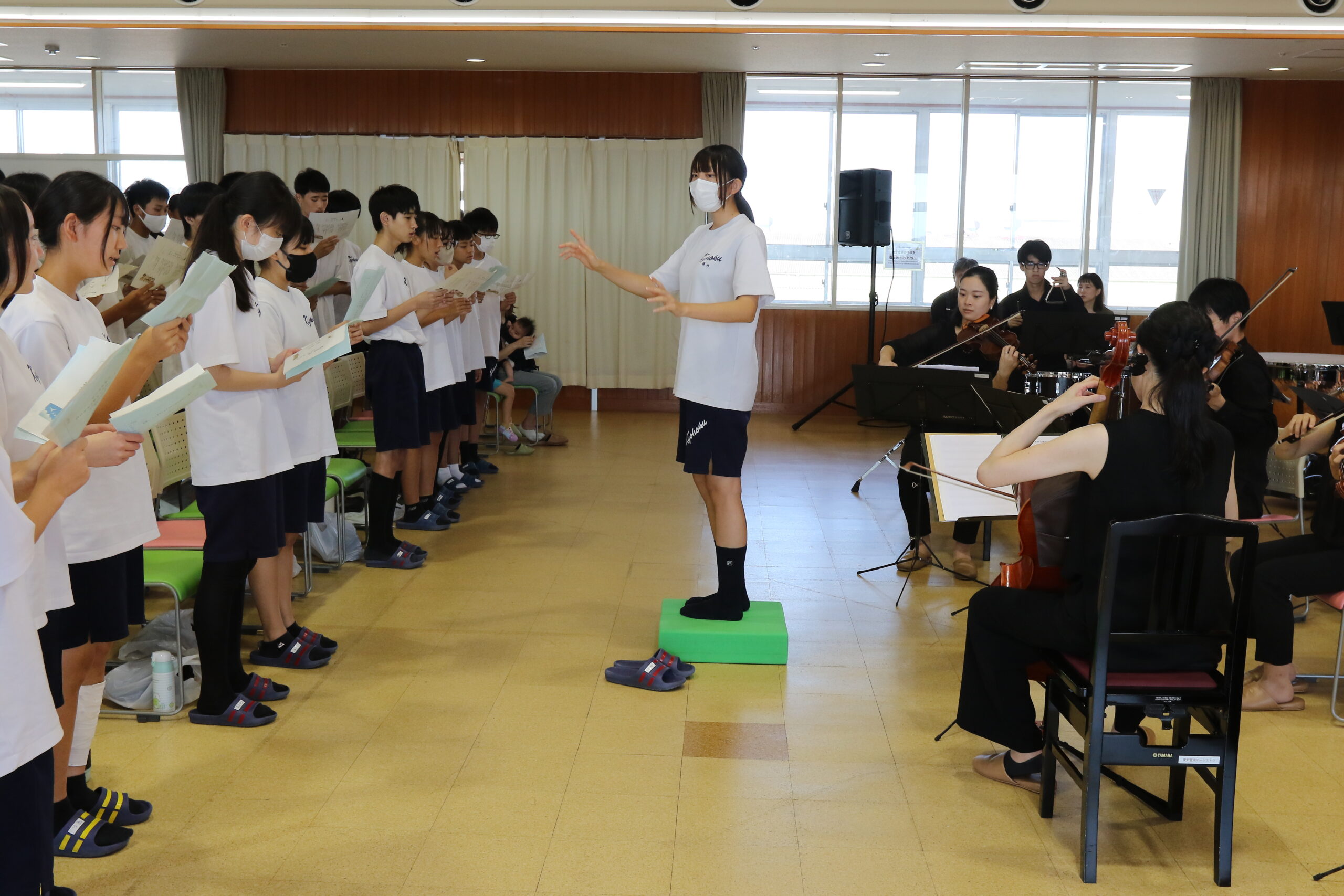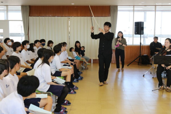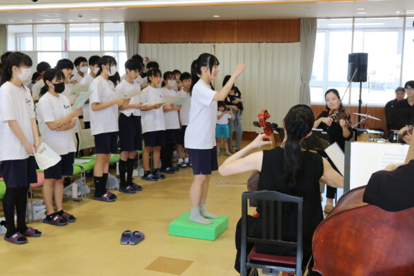 四日市市の橋北交流会館で13日、学び舎(や)音楽会が開かれ、橋北中学校の生徒約90人がオーケストラの演奏に耳を傾けました。