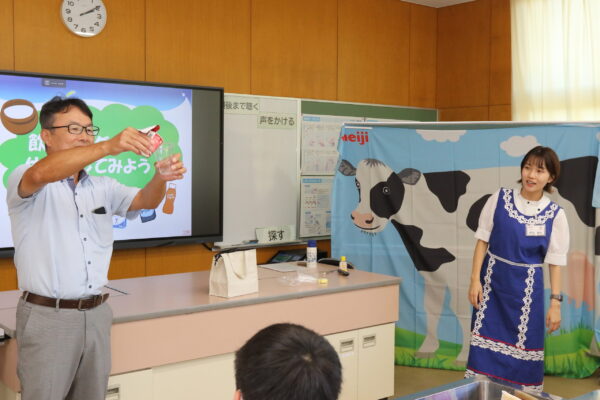 固形と液状ヨーグルトの違いの体験もあり、児童は立ち上がって固形が入った容器を3分ほど振り続けて液状にしました。