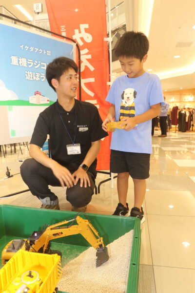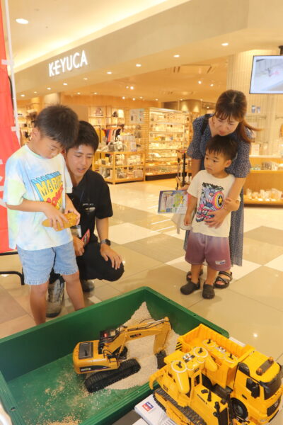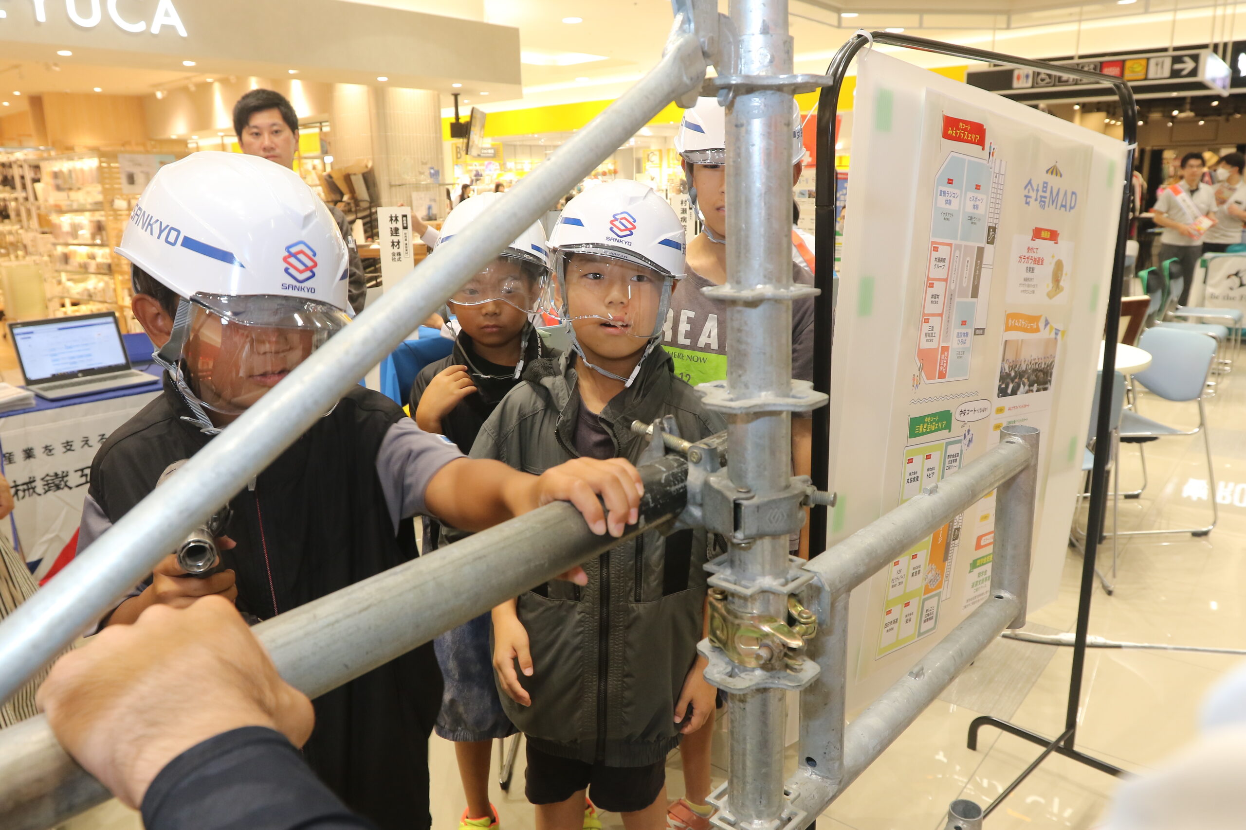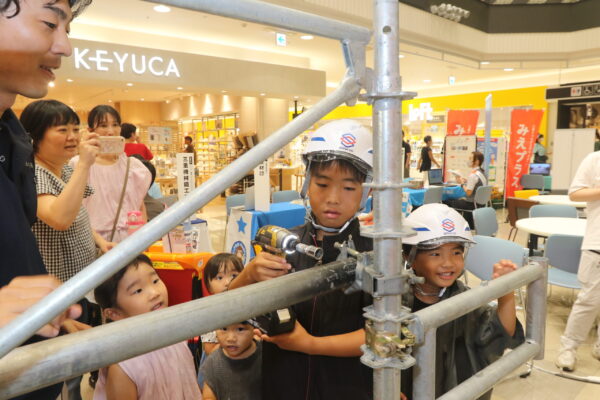 子どもたちは足場作業、重機ラジコンの操作、レースゲームなどを体験し、会社概要を熱心に聞く親子の姿も。
