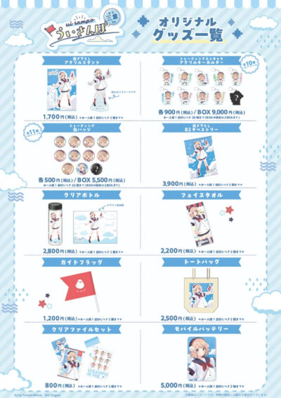 オリジナルグッズは描き下ろしアクリルスタンド1,700円(以下全て税込み)、全10種のアクリルキーホルダーは各900円、全11種の缶バッジは各500円、フェイスタオル2,200円などを桑名市のナガシマファーム、菰野町のグリーンホテルで販売。物販会場には等身大パネルもあります。