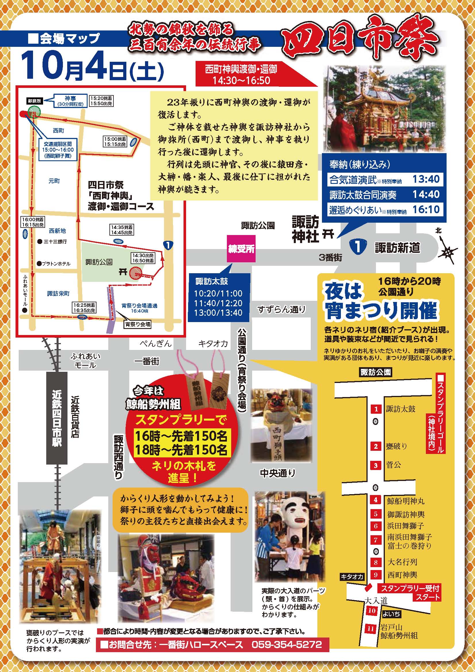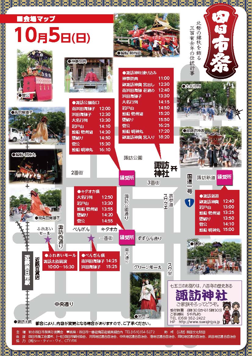 5日▽11時、神事祭典▽12時30分、御諏訪みこし宮出し▽12時40分、南浜田舞獅花納め▽13時30分、浜田舞獅子▽14時15分、大名行列▽14時50分、岩戸山▽15時20分、鯨船勢州組▽15時50分、甕破り▽16時25分、菅公▽17時20分、鯨船明神丸▽18時20分、御諏訪みこし宮入り