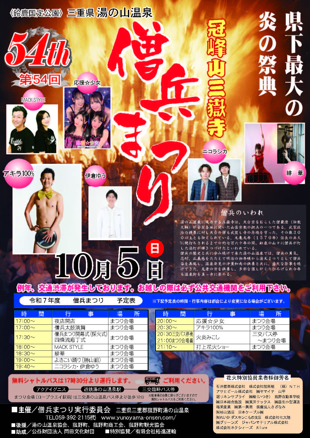 火炎みこしのほかに、お笑い芸人アキラ100%さん、伊倉ゆうさん、ニコラシカらのショー、四日市市の観光大使マック中原さんと石田翠さんのデュオMACK STYLE、名古屋拠点のアイドルグループ応援☆少女、鈴鹿ときめきカルチャー大使を務める太鼓奏者の凛さんと津軽三味線の加賀丈子さんのデュオ緋華のステージが祭りを盛り上げます。