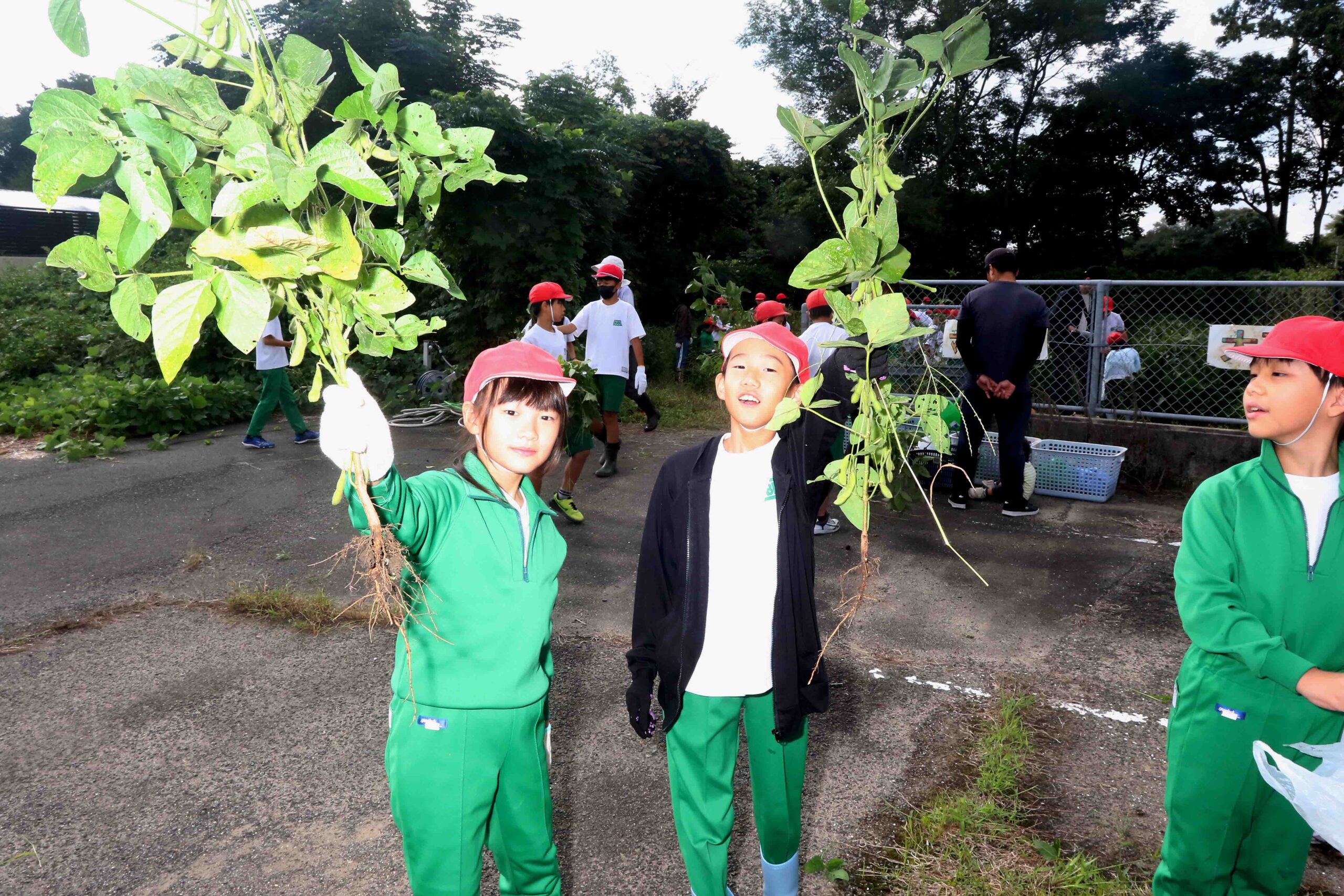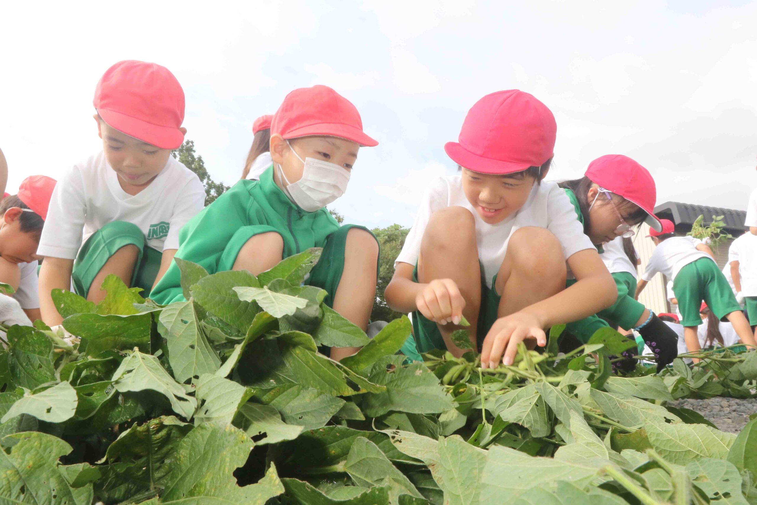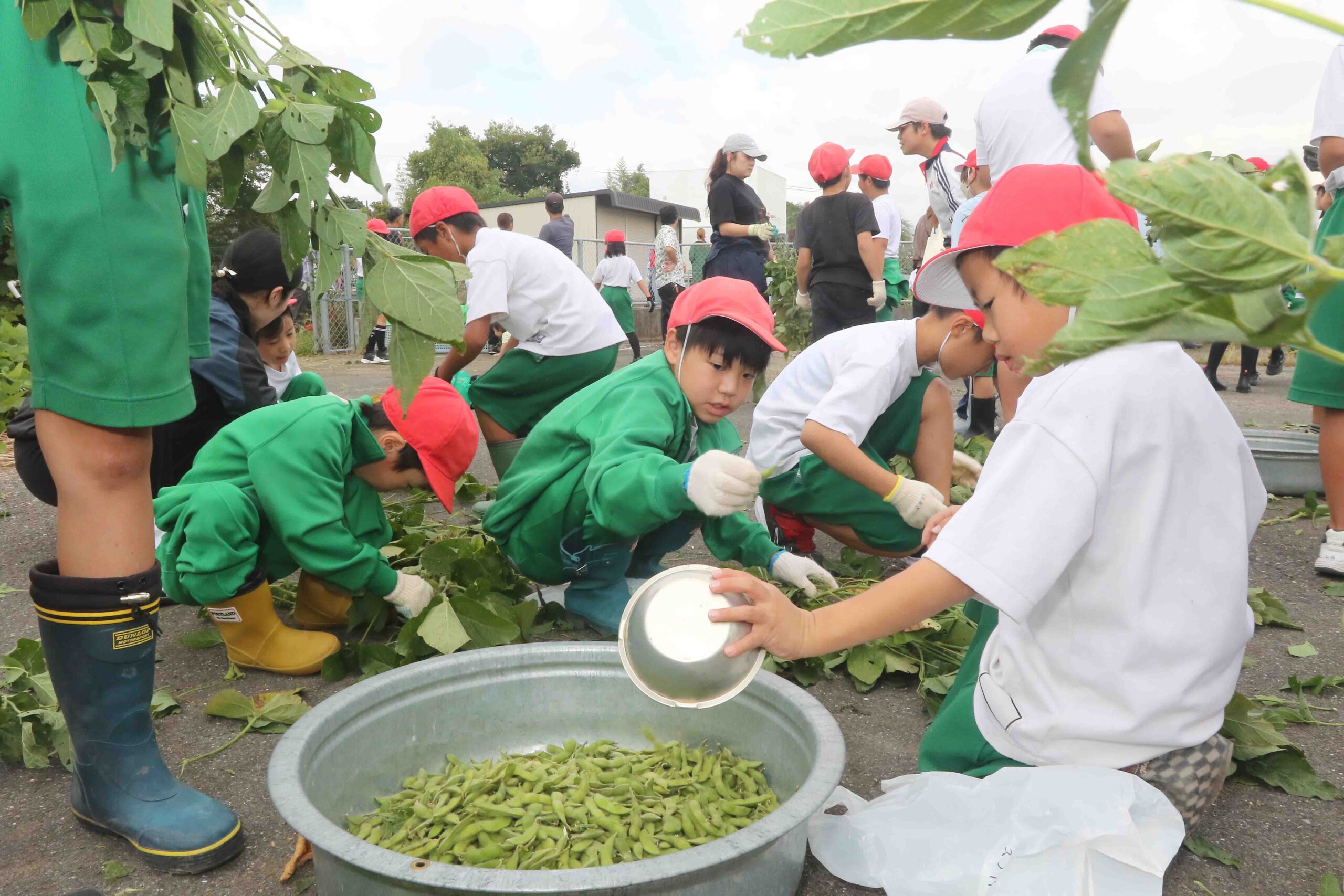 東員町の稲部小学校(山中久佳校長)で1日、全児童約260人が校内外の畑で育てた枝豆の収穫に取り組みました。