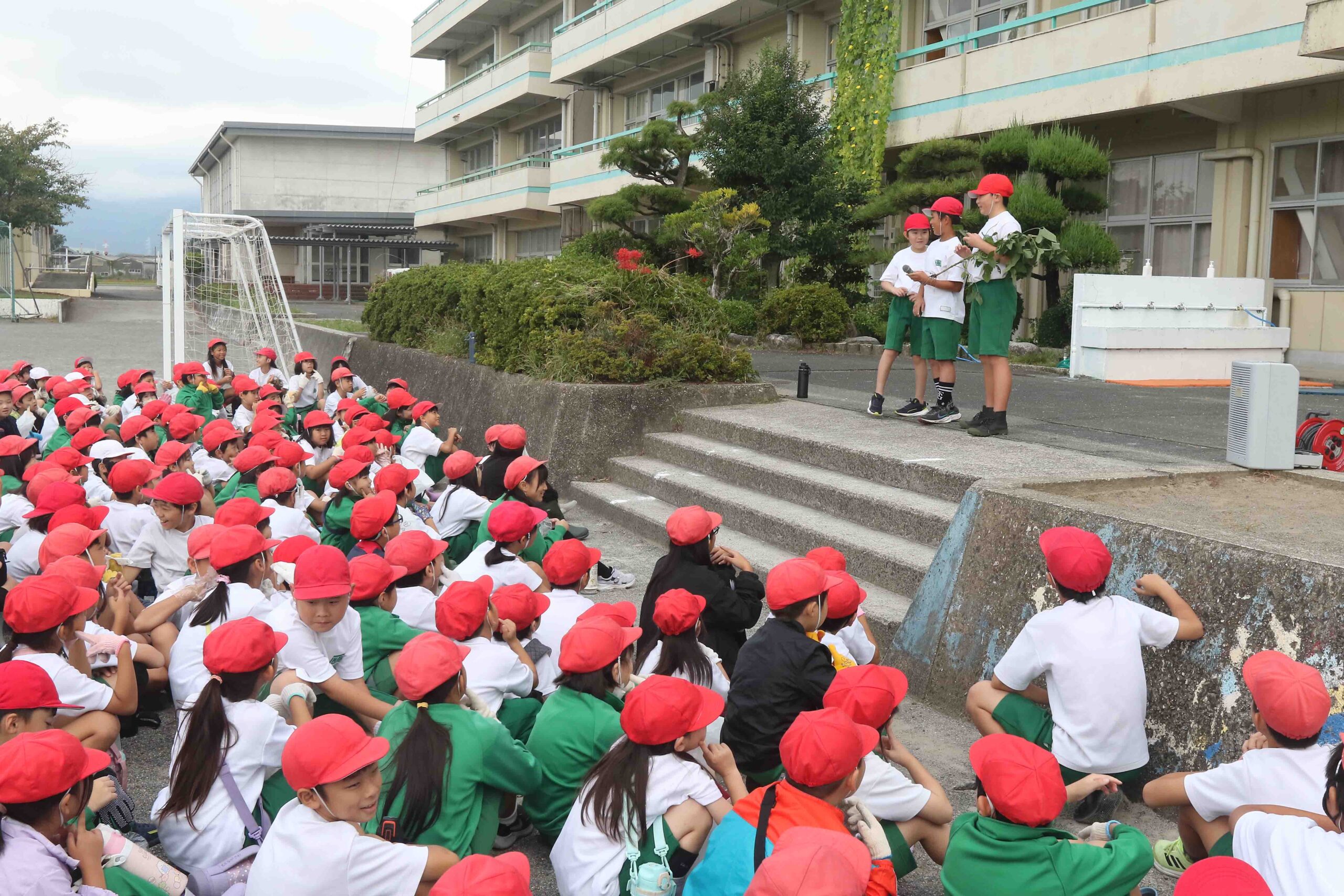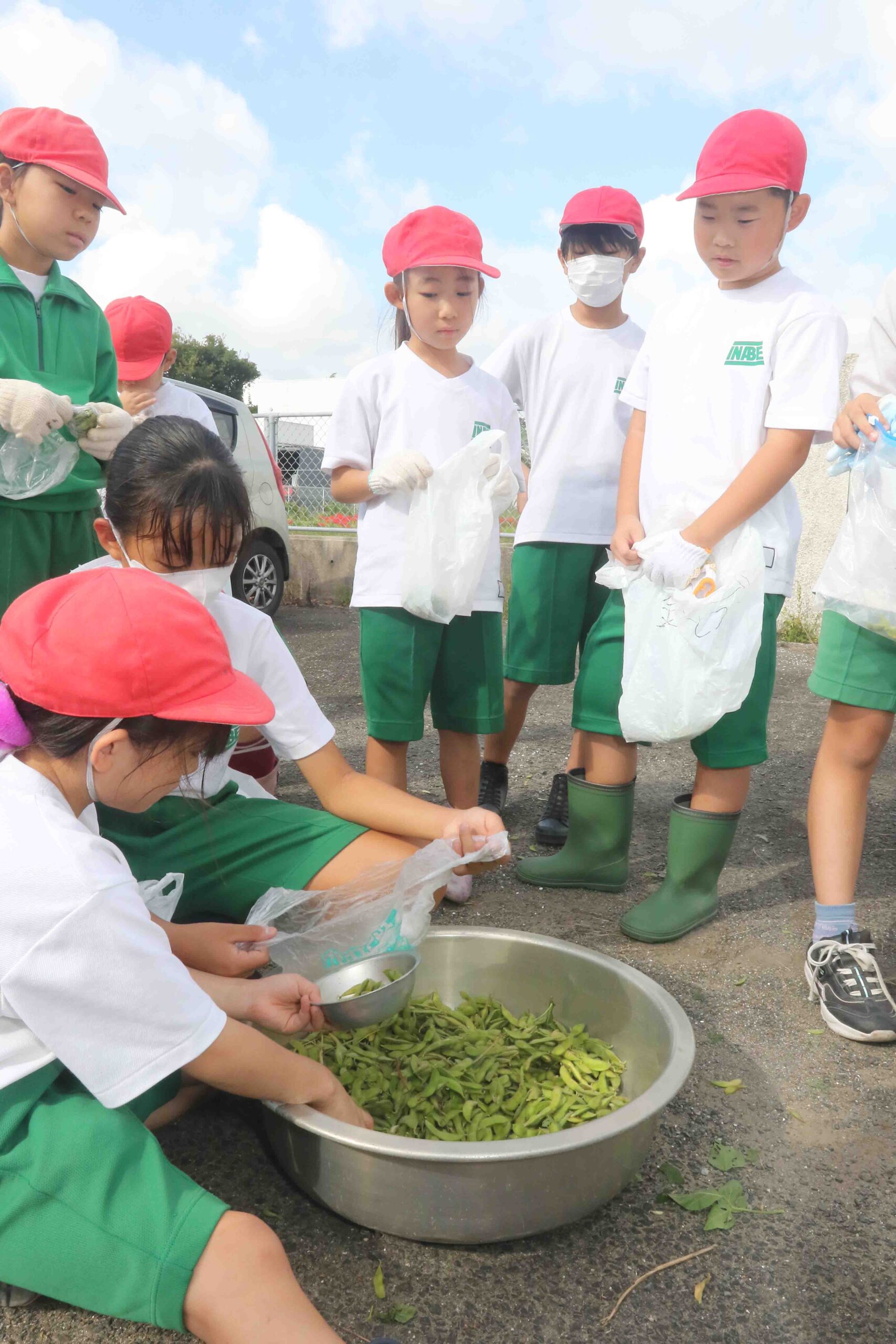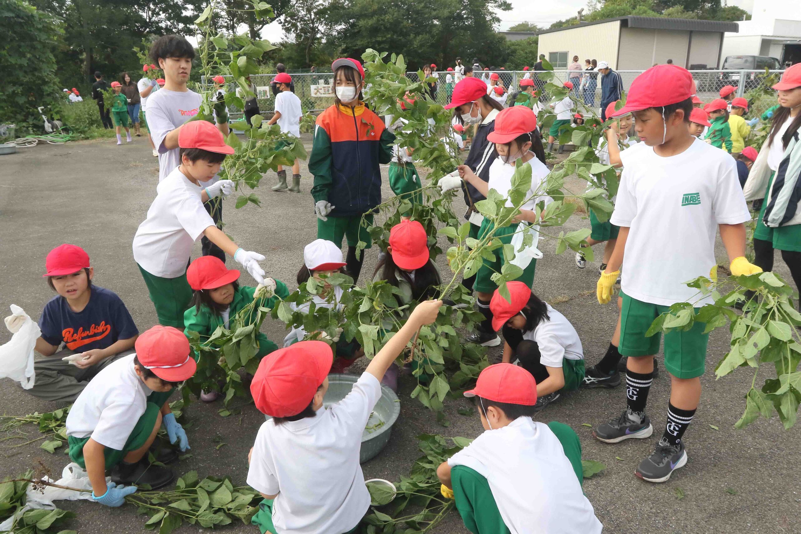 東員町の稲部小学校(山中久佳校長)で1日、全児童約260人が校内外の畑で育てた枝豆の収穫に取り組みました。