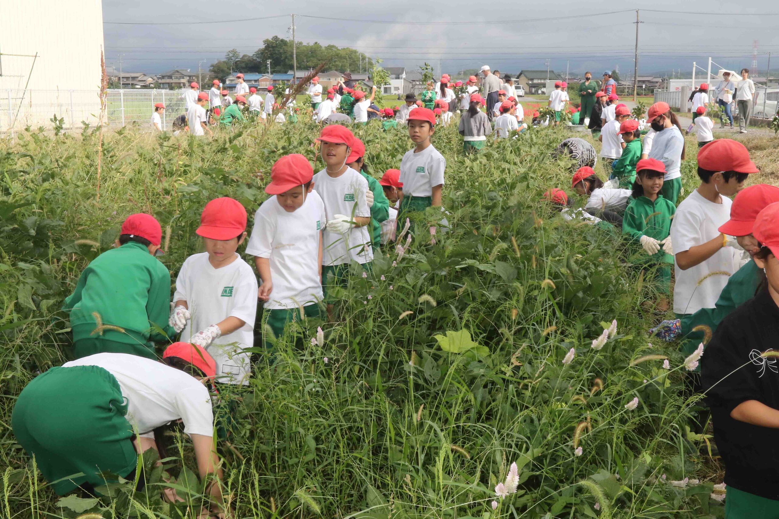 根が張り、数人で「よいしょ」と声を掛けながら引っ張って抜いたり、低学年の児童の中には自身の背丈を超えるほどに伸びた株を持って来たりする姿も。