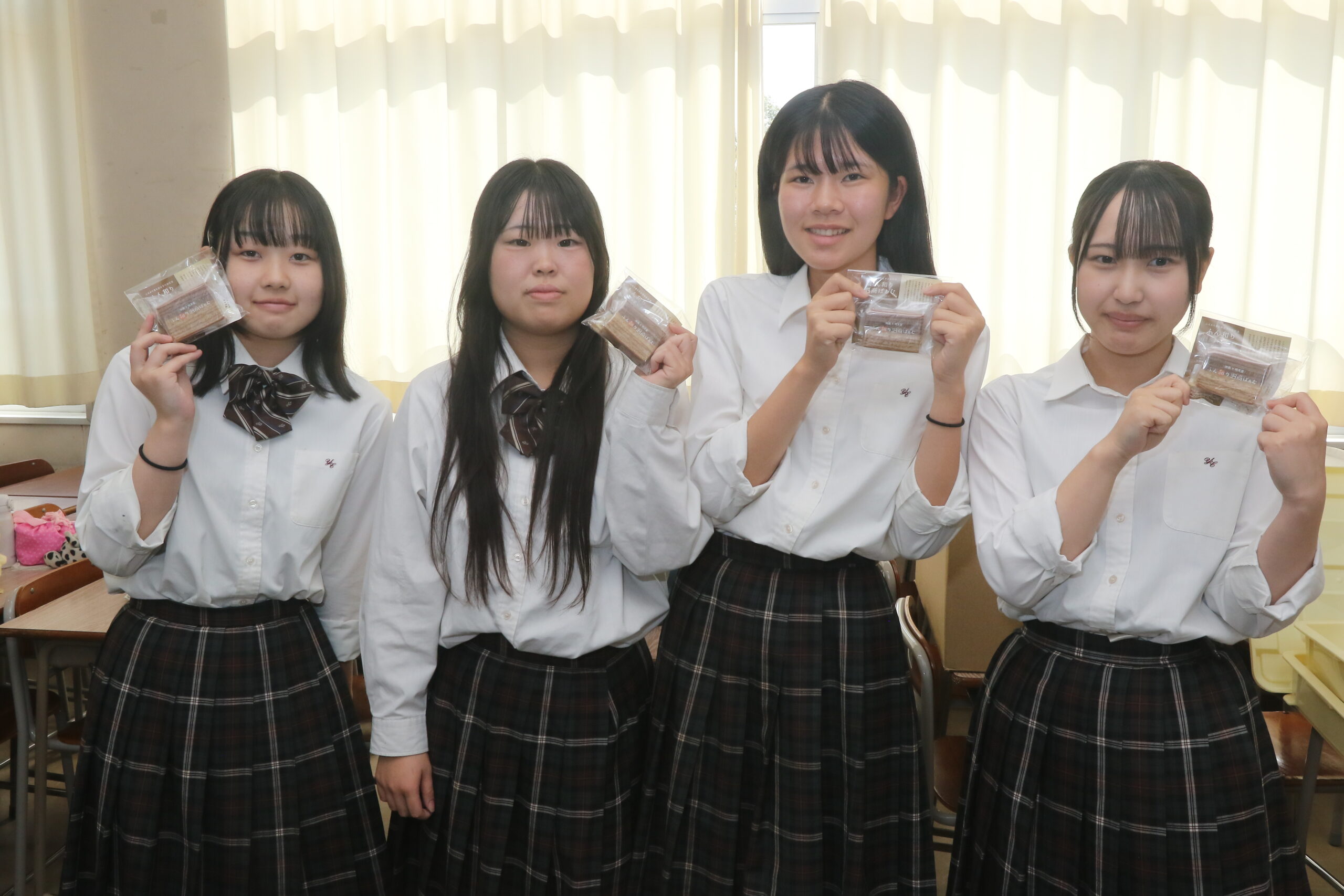 新商品の『ふん和り~』は、同校の制服のブラウンを、チョコとプレーン味の生地2層で表現。市内生産の和紅茶『べにふうき』も入れてあります。