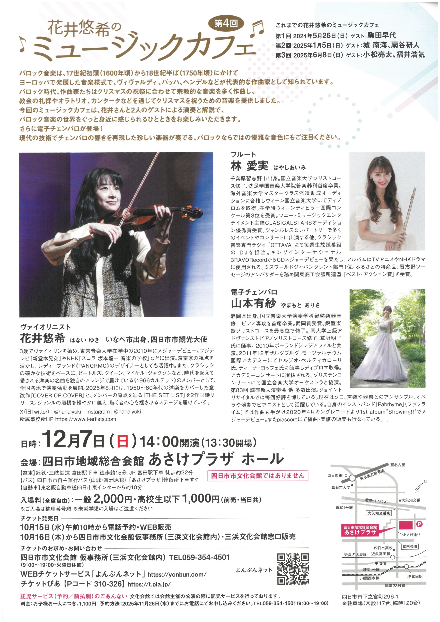 四日市市の観光大使でバイオリニスト花井悠希さんが、ゲストとともに音楽の魅力を届けるステージ『花井悠希のミュージック・カフェ』が12月7日14時、同市下之宮町のあさけプラザで開催されます。