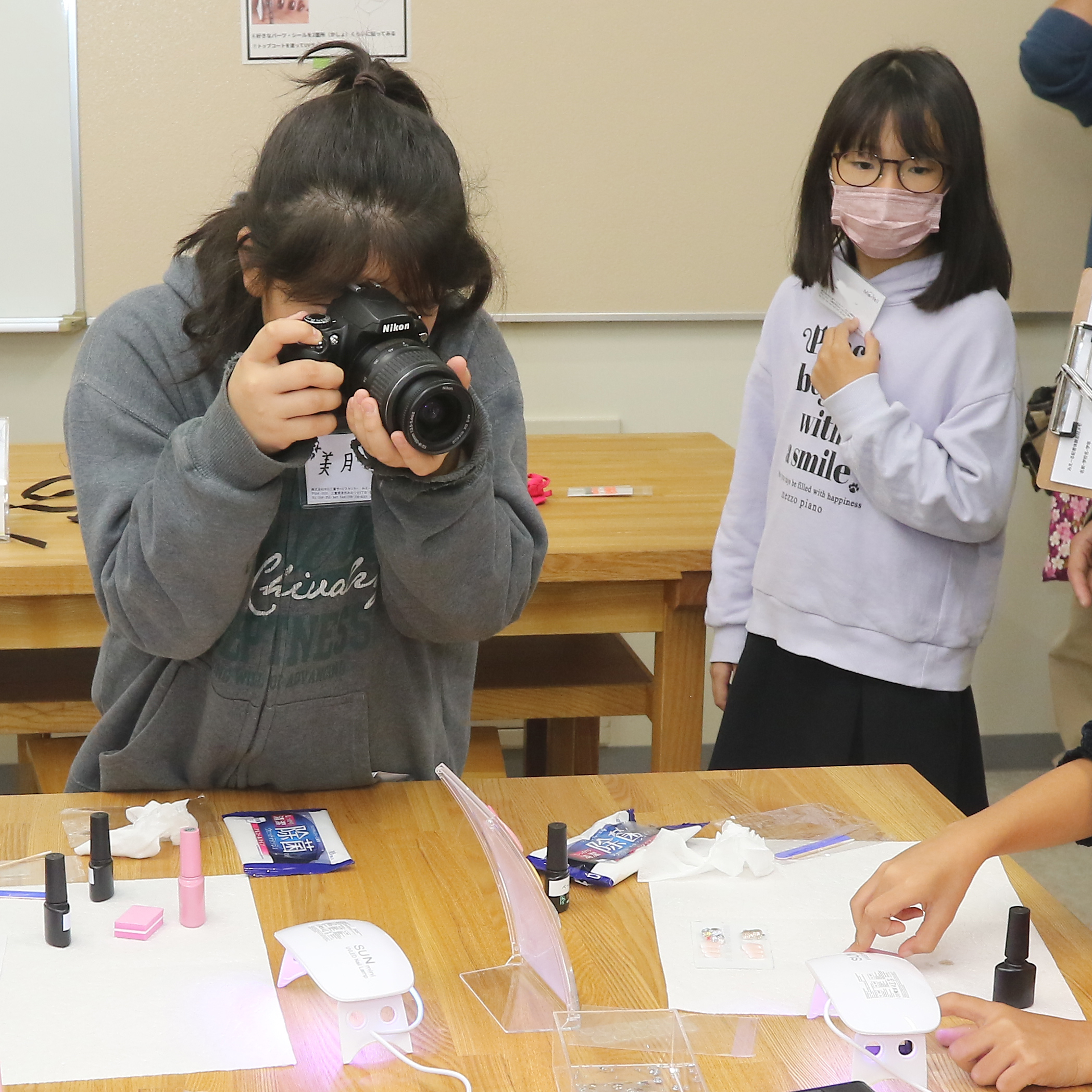 ▽ネイリスト体験を取材しました。参加者は真剣な表情で爪に色付けをしいていました。先生は「お客さんが喜んでくれるのがうれしい。未来のネイリストが増えるといいな」と話していました。