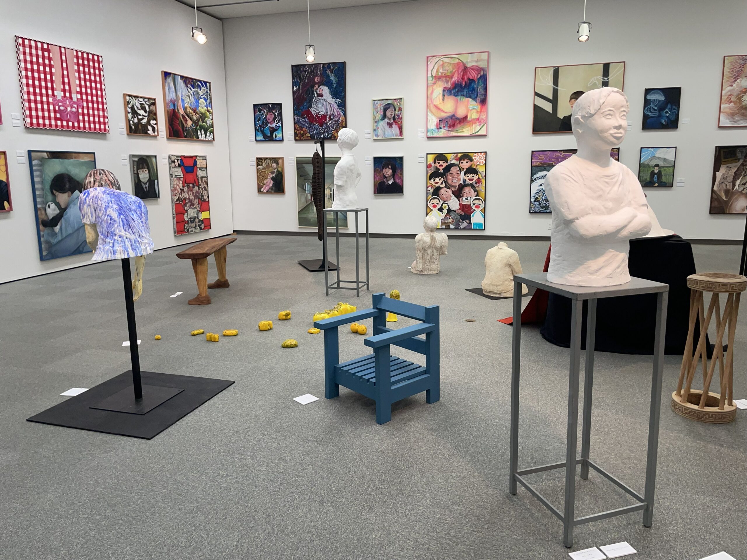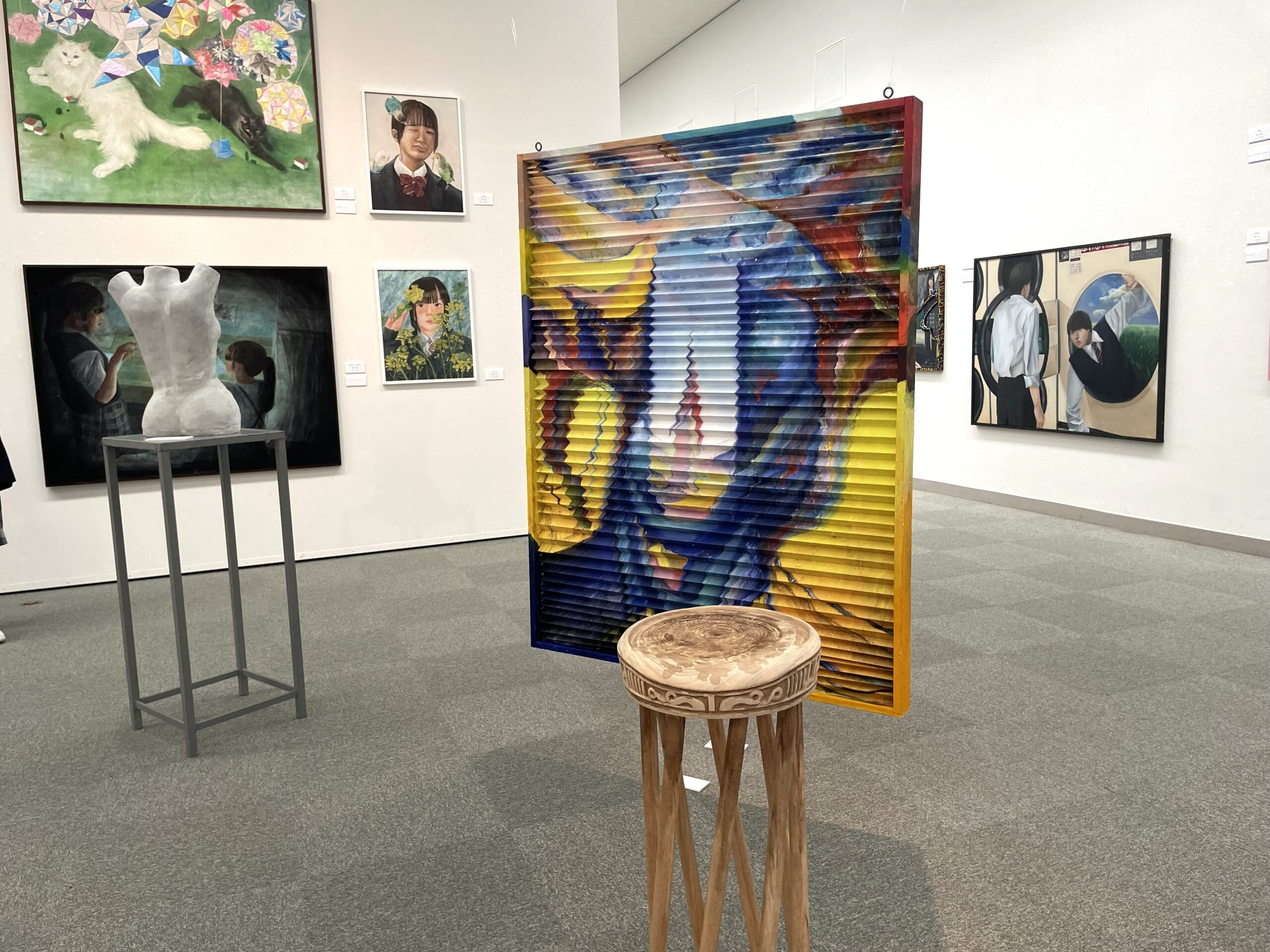 油彩画や日本画で描いた自画像、戦争をテーマに制作したCGポスター、鈴鹿市の伝統工芸伊勢型紙の技術を利用して制作した服、リンゴから発想を得てデザインした椅子など、3年生75人が制作した約170点が並びます。