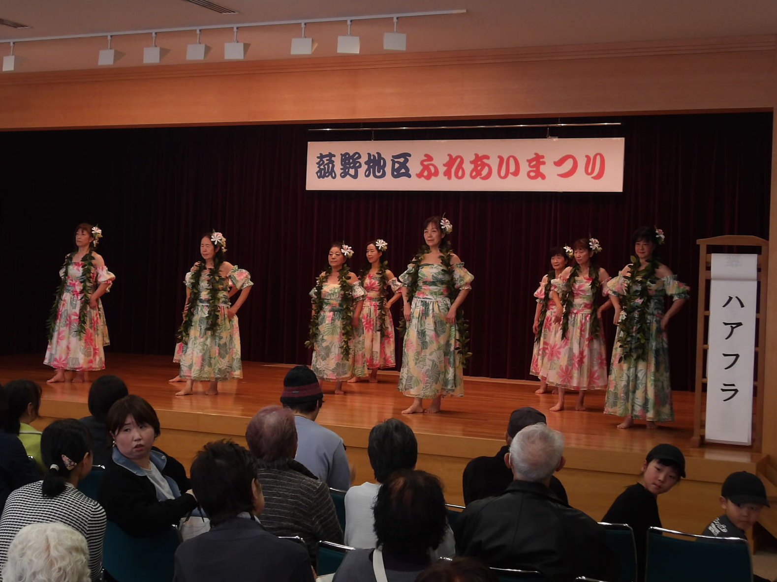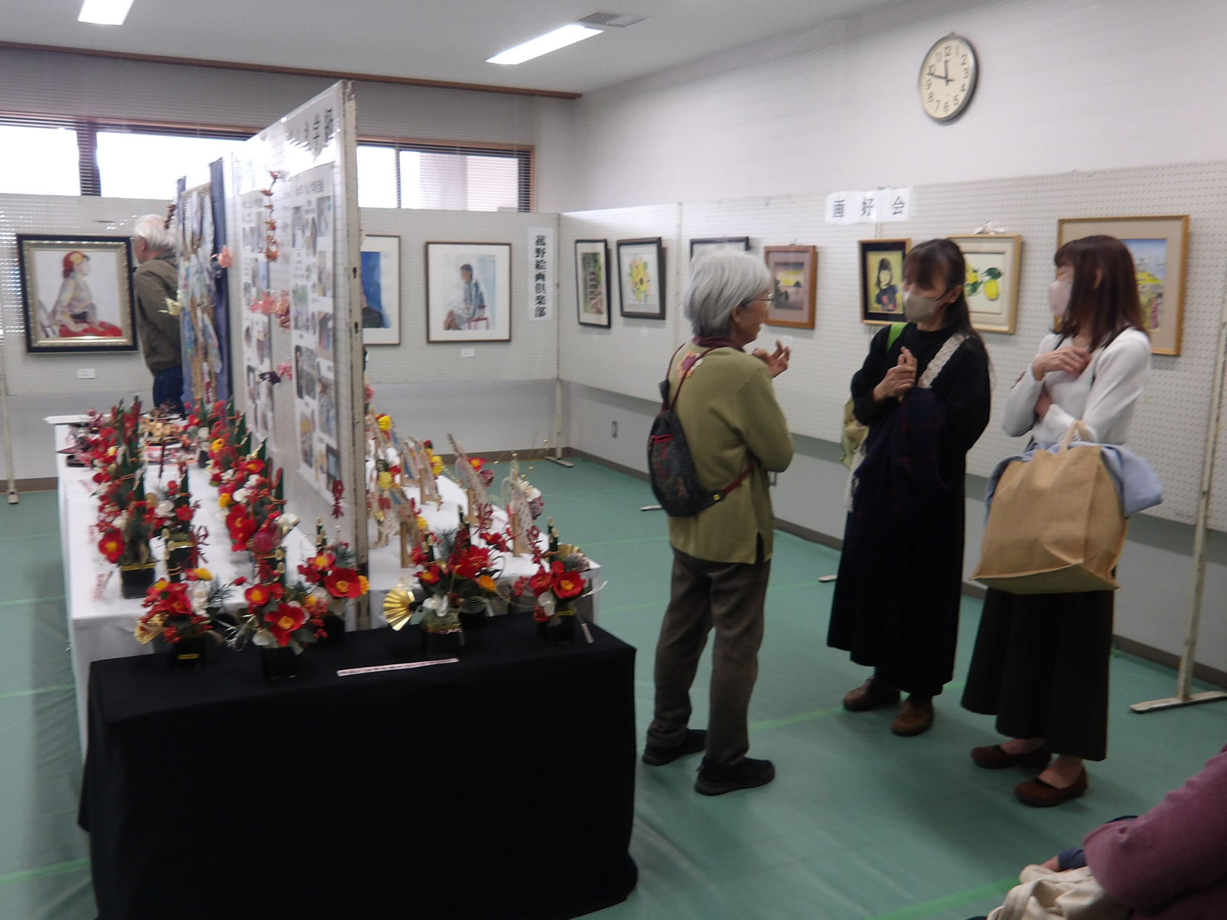 園児の歌、フラダンスなどの舞台発表、公民館学級活動、迎春リース、門松などの展示もありました。