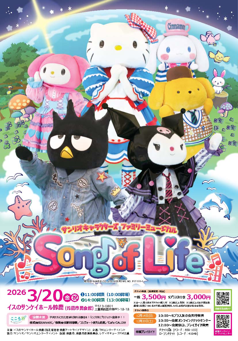 2025/12/1825/12/18 人気サンリオキャラと楽しもう ファミリーミュージカル『Song of Life』 3月20日 鈴鹿市のイスのサンケイホール鈴鹿