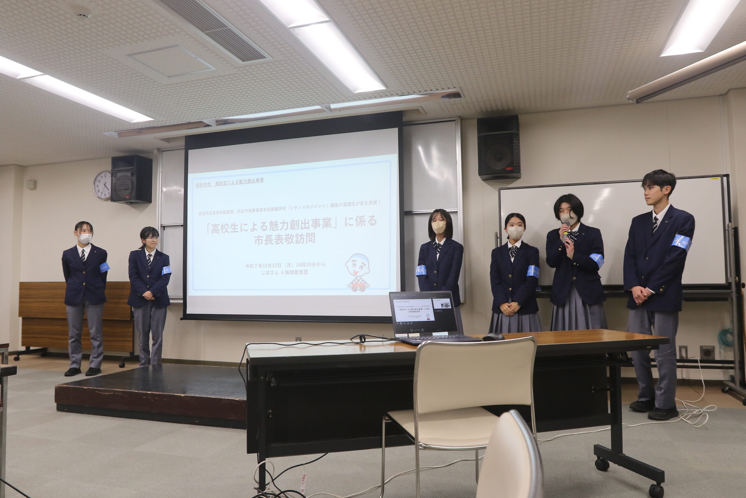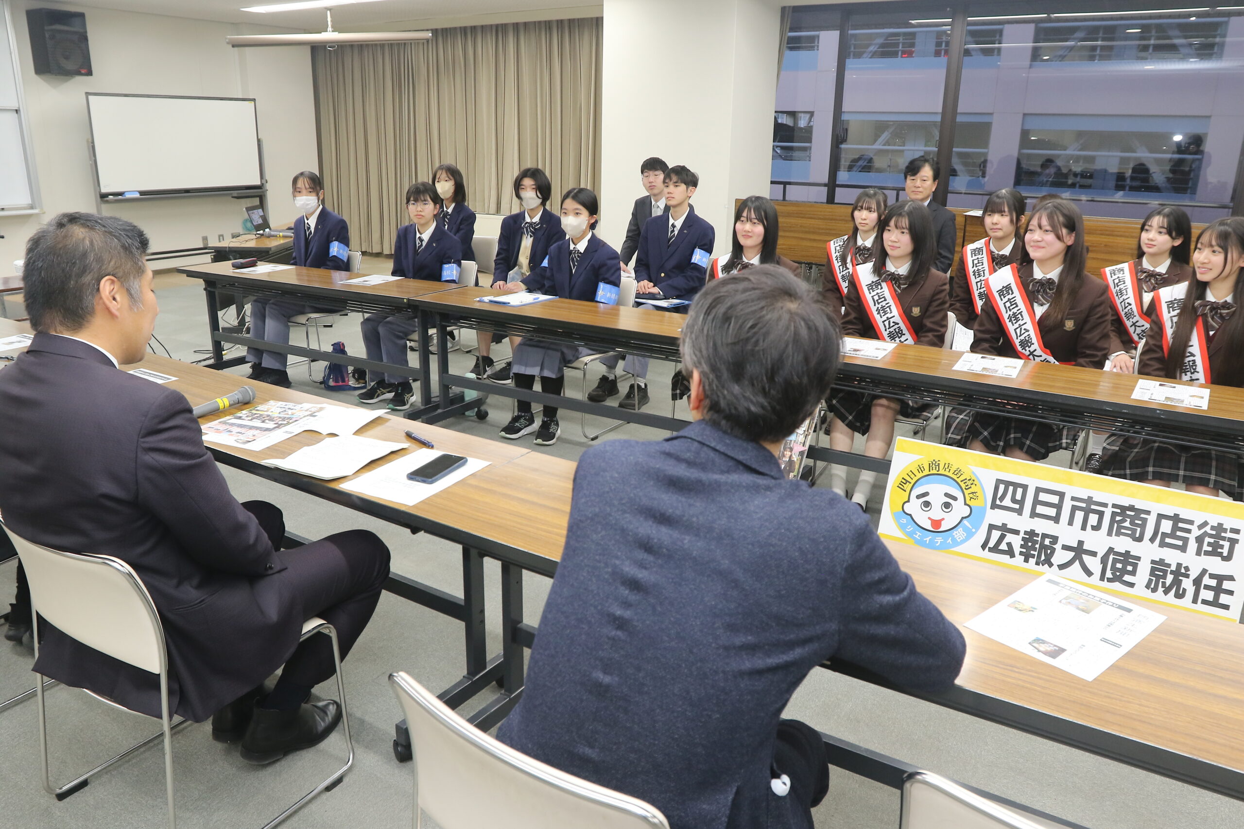 22日、同市の地場産業振興センターで、森智広市長、森修平四日市商店街連合会会長、長谷川進同副会長らに、活動内容や工夫した点などの報告をしました。
