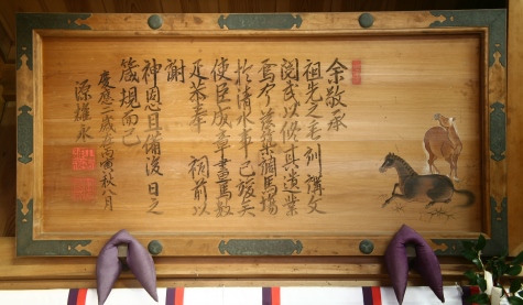 同町教育委員会発行の『こもの文化財だより12号』には、絵馬や算額、金的などについて解説され、同神社の拝殿内の一つ、江戸時代後期の菰野藩12代目藩主土方雄永が慶応2(1866)年に奉納した絵馬『練馬』は、幕末に新しく練兵場を設けた内容が描かれ、雄永が藩士の羽田成章に命じて描かせたものと記されています。
