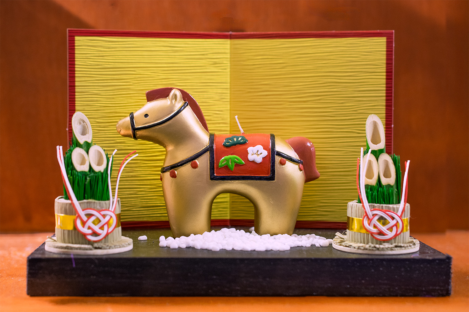 ローソクは長さ約130㍉、高さ92㌢、幅31㍉で、白馬の背中に芯があります。下鞍の松竹梅、たてがみ、尻尾は金色、手綱、胸がい、尻がいは赤色。パラフィン製の台座付です。