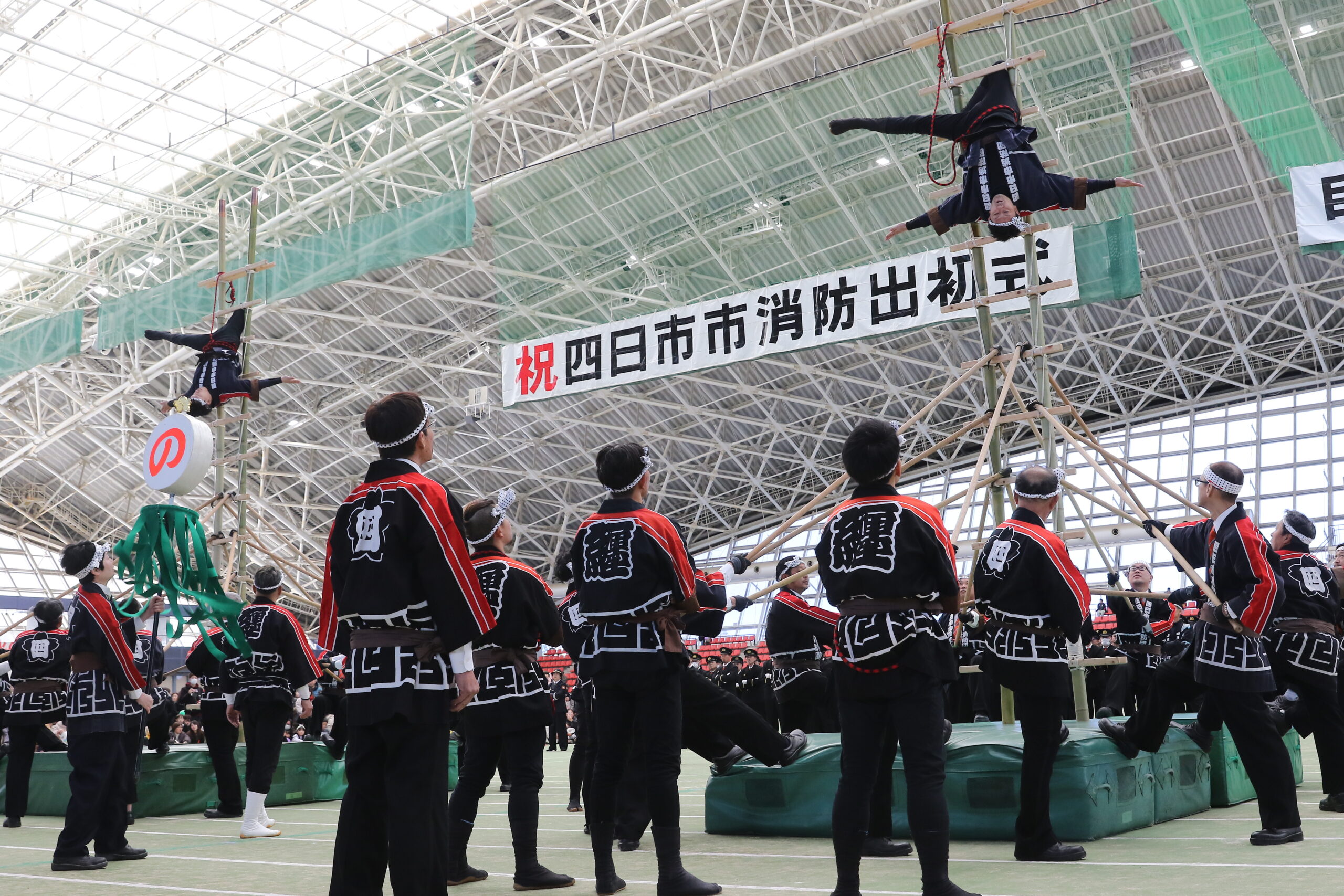 四日市市の消防出初め式が11日、四日市ドームで開かれ、消防団員の永年勤続表彰、はしご登りの演技、園児らの歌と踊り、同市出身でプロ野球横浜DeNAベイスターズの東克樹投手のトークショーなどがありました。