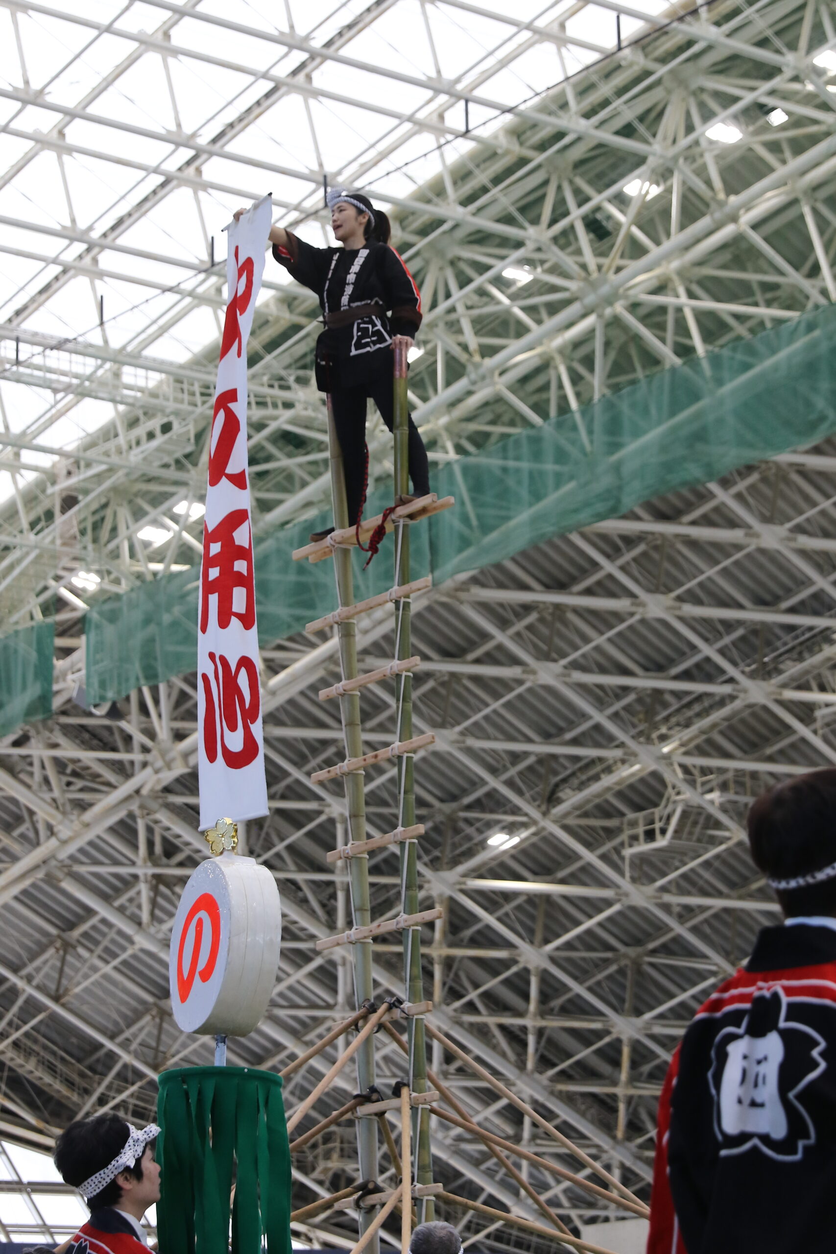 はしご登りには分団員約70人が参加。高さ6㍍のはしご上で、足首を固定しながらの逆さの姿勢やシャチホコのように反りあがる演技を披露。「えいやー」と掛け声を上げ、技が決まるたびに会場から歓声と拍手が起こっていました。