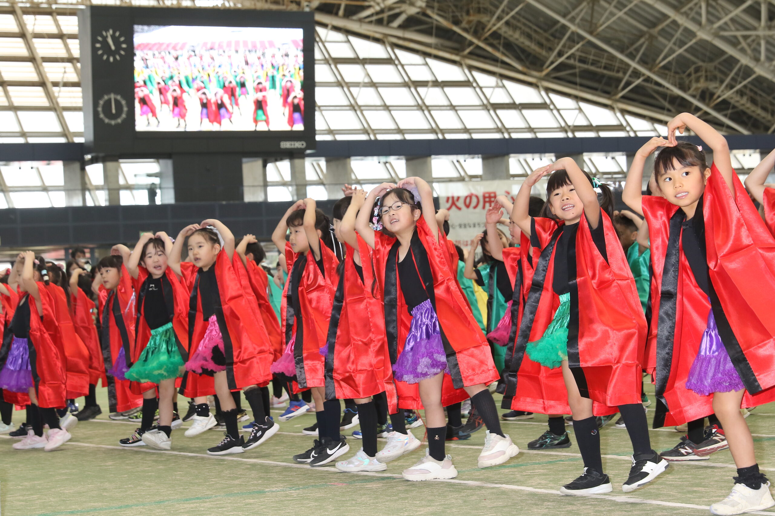 園児の歌と踊りは東選手の出身でもあるエンゼル幼稚園の年長児約150人が、開園70周年を記念した歌やソーラン踊りを披露していました。