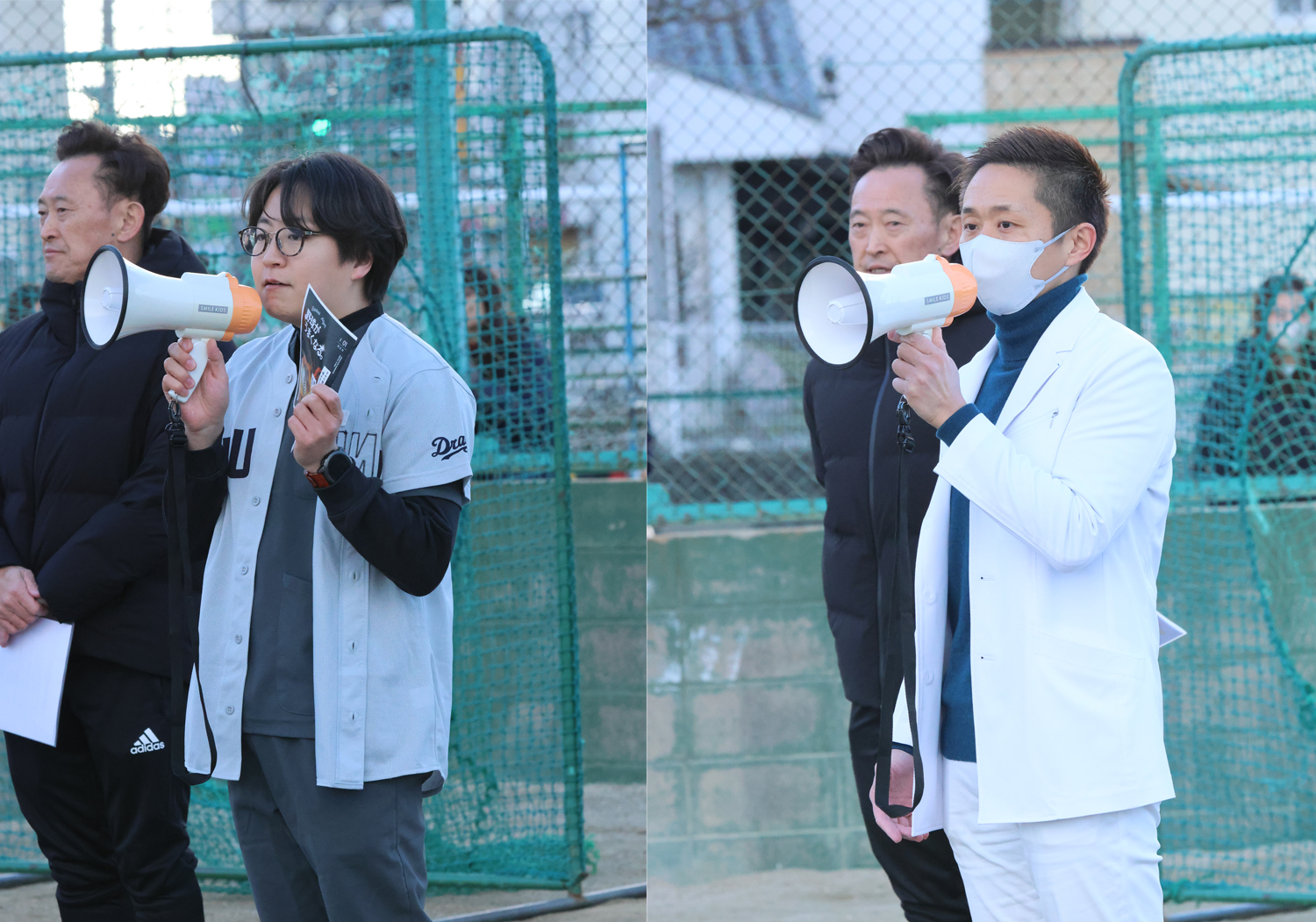 写真は上から指導した彦野さん㊨、平田さん㊥、岡田さん。主催者あいさつをする江島院長㊨と萩野谷院長。野球教室の様子