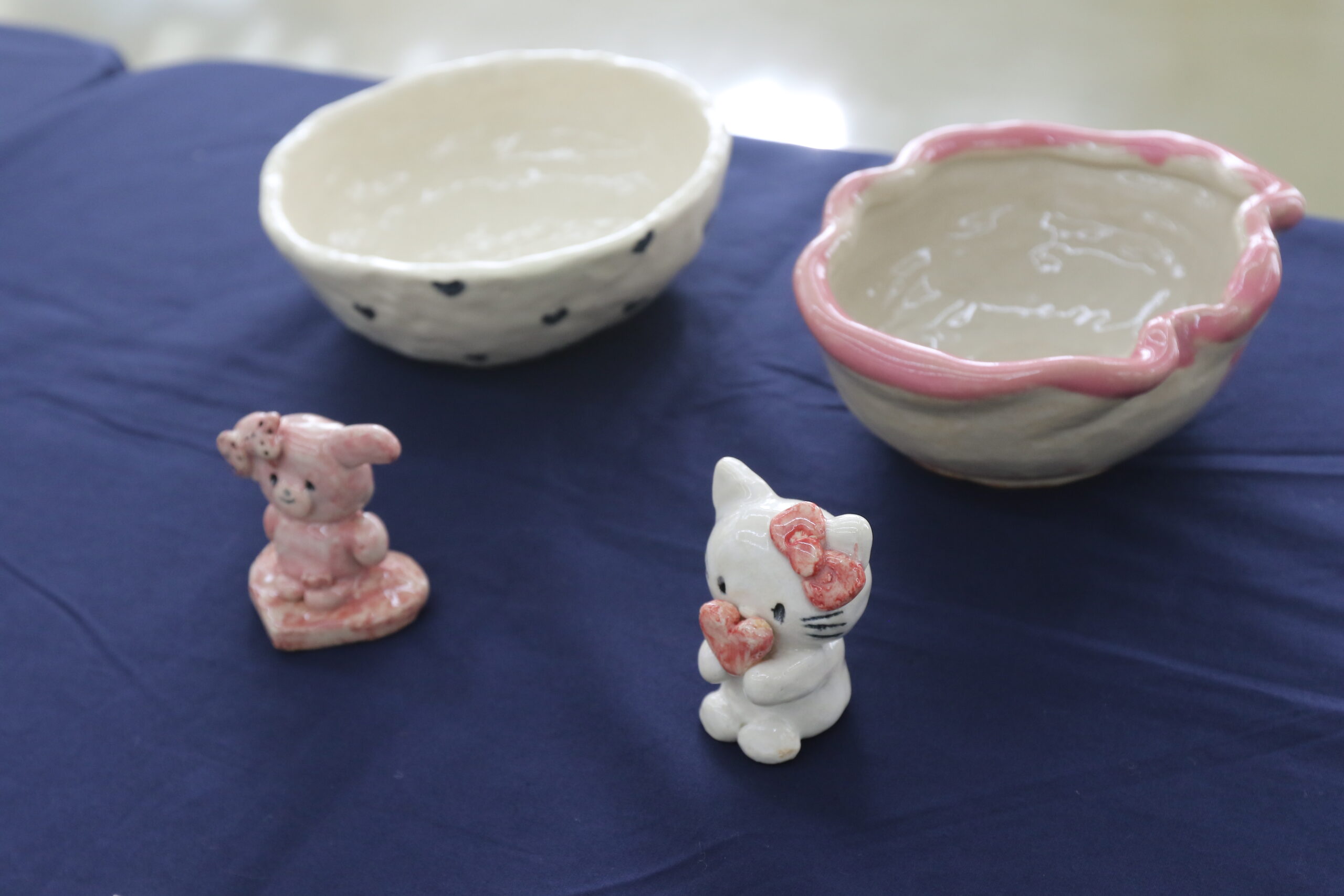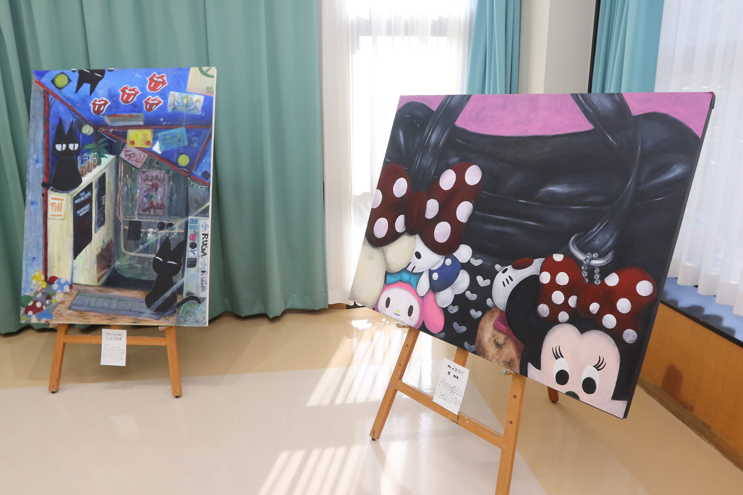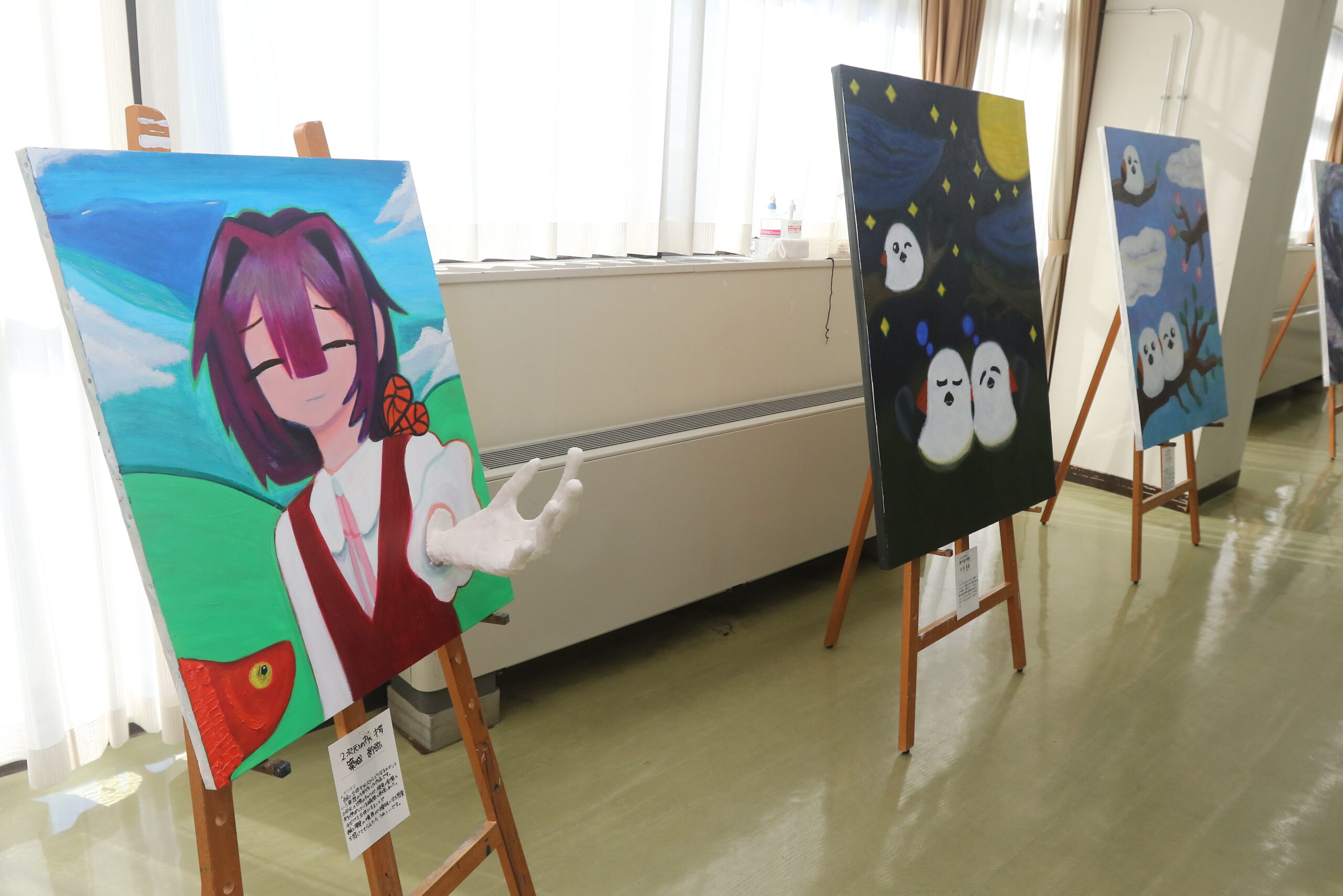 美術コースは油絵の具などで描いた作品や陶芸、約100点を出展。たくさんのぬいぐるみを飾り付け3年間登下校を共にしたスクールバッグ、「絵に立体を加えたらどうなるか」との発想で、微笑む少女の手が立体的に前に差し出されている作品などが飾られています。