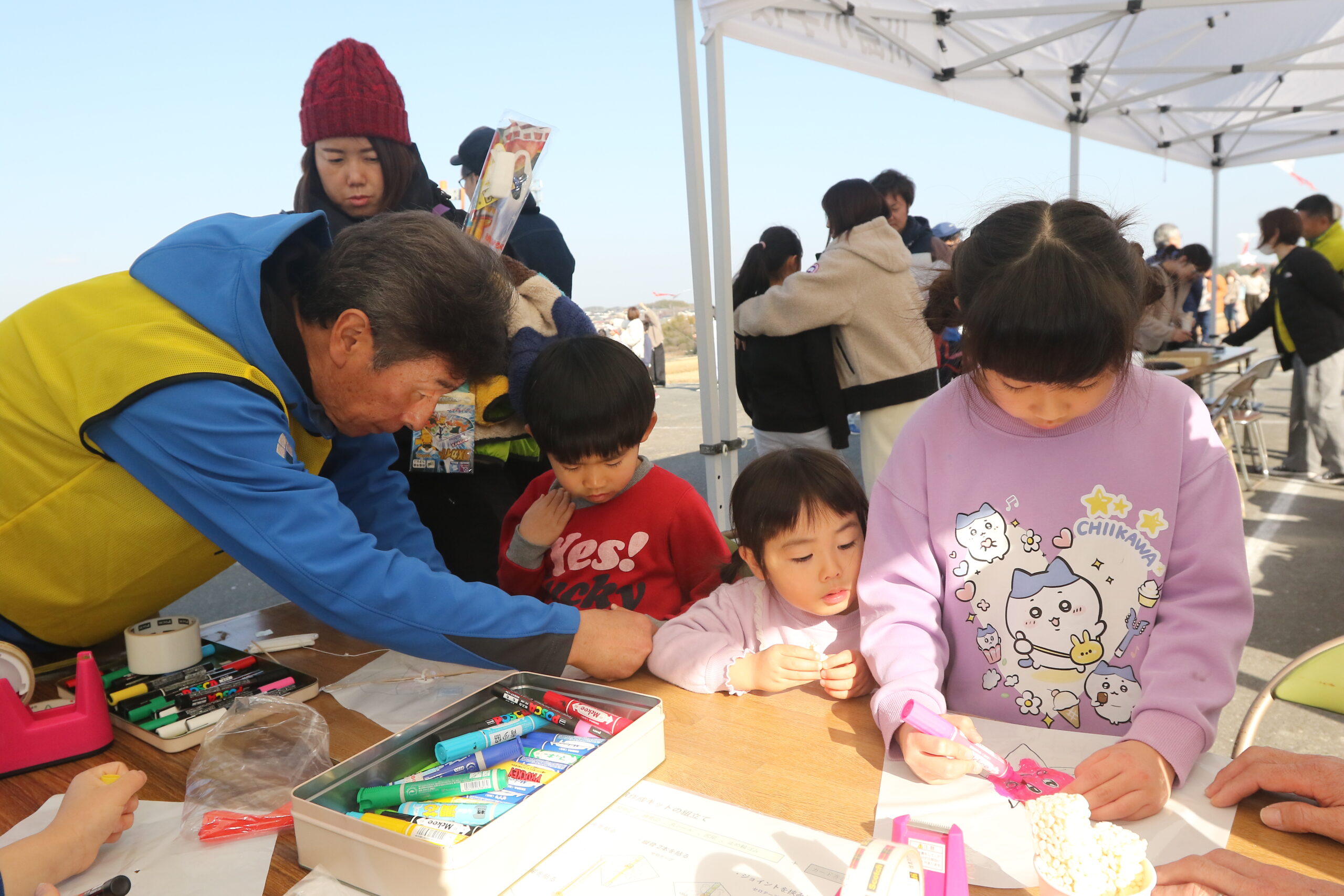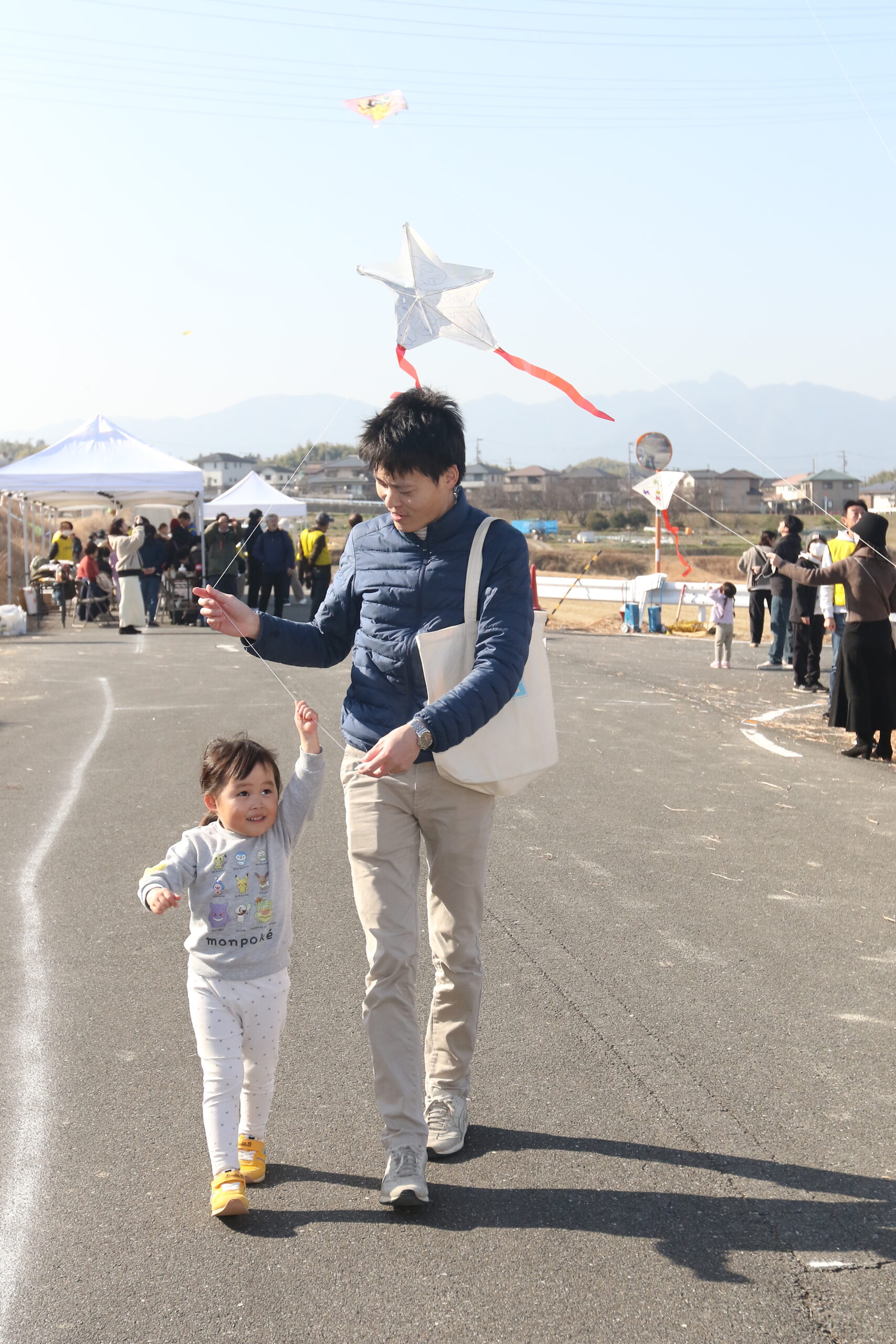 あらかじめ配布された、たこにアニメキャラなどを描いたものや、星の形をしたものなどを大空に掲げました。