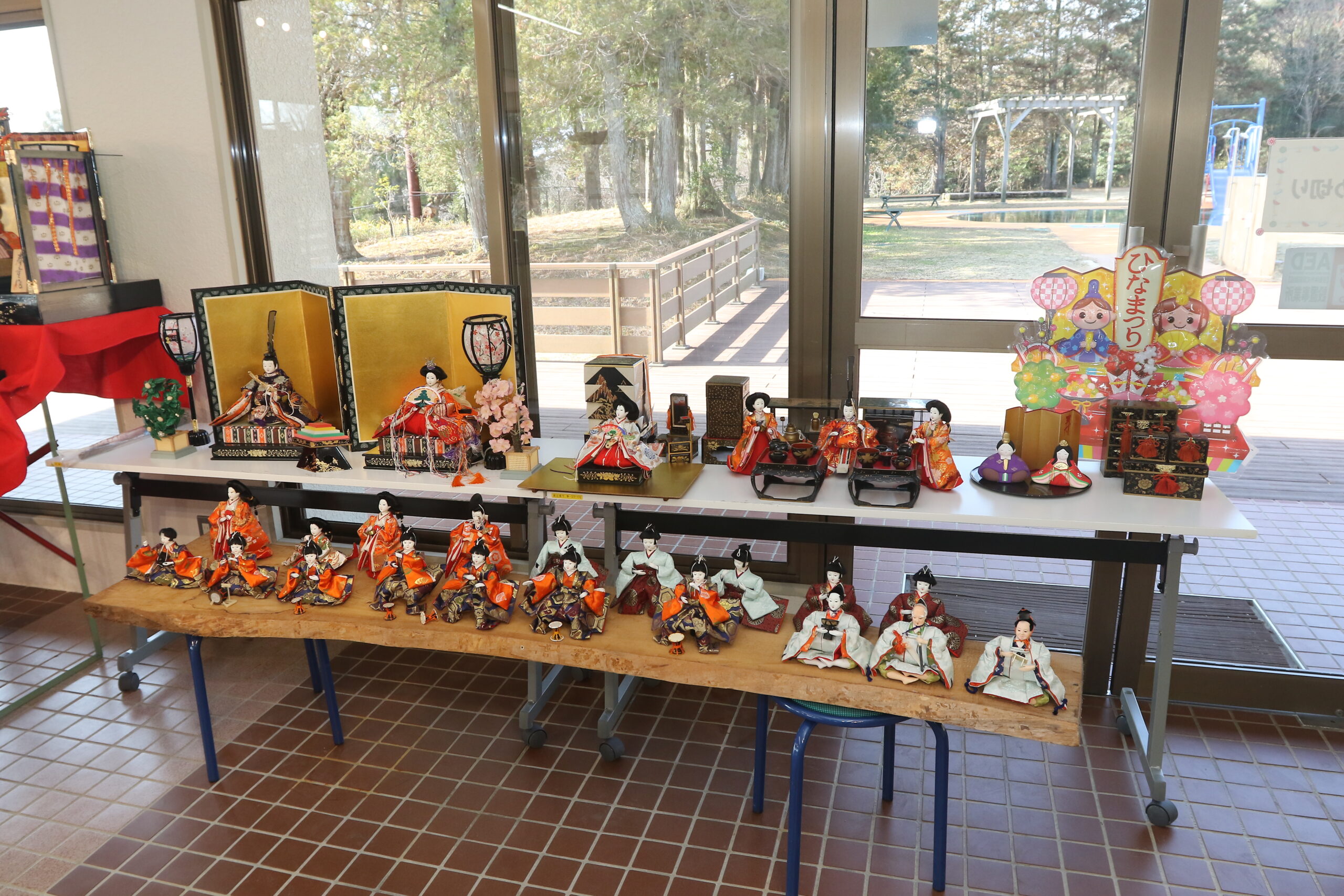 四日市市桜町西の四日市スポーツランドに、春を先取りさせるひな人形4セットが飾られています。
