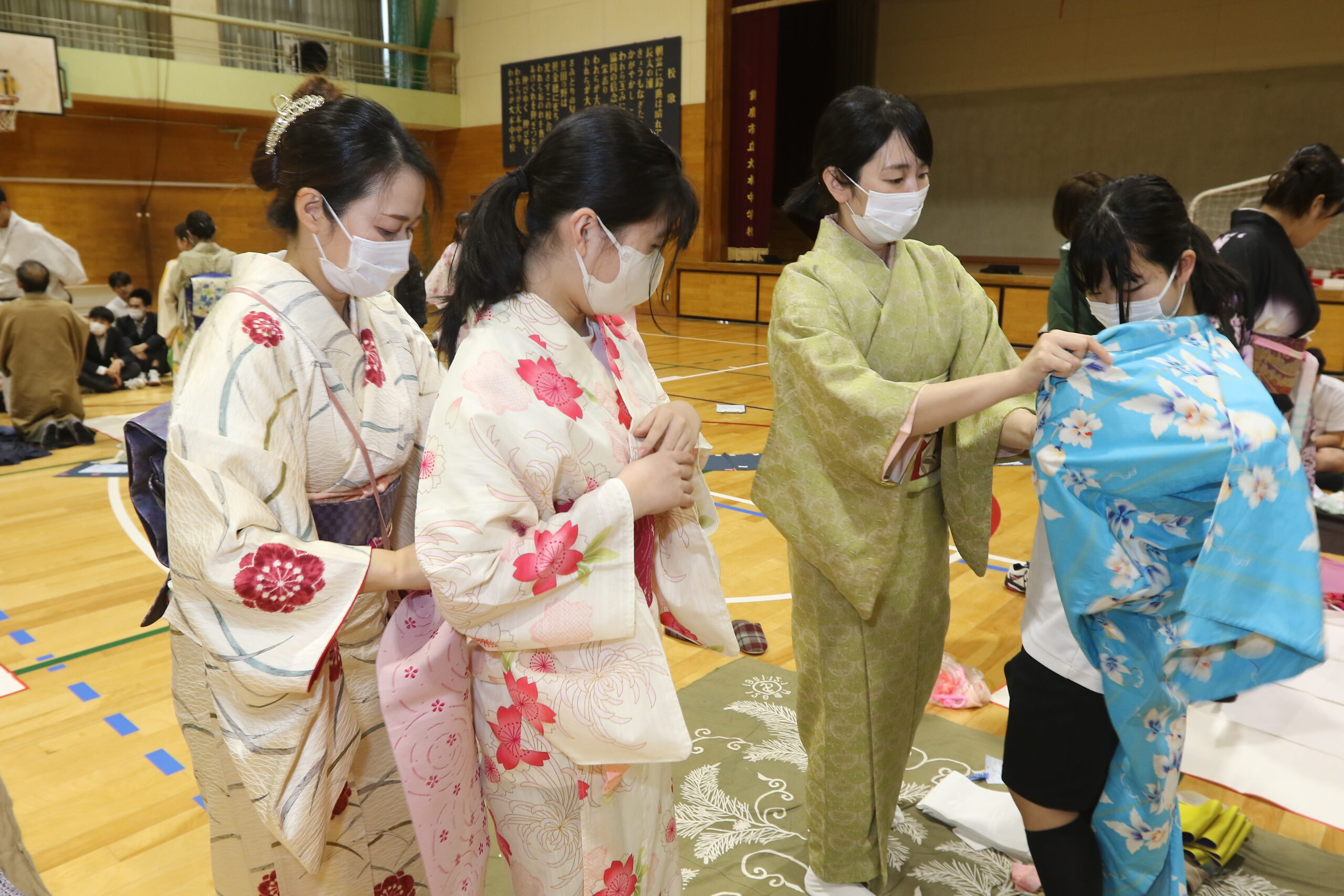 教諭2人と生徒29人がモデルとなり、振り袖や浴衣の着装実演も。男子は兵児帯(へこたい)や角帯で、女子は一般的は文庫結びで仕立てられていました。