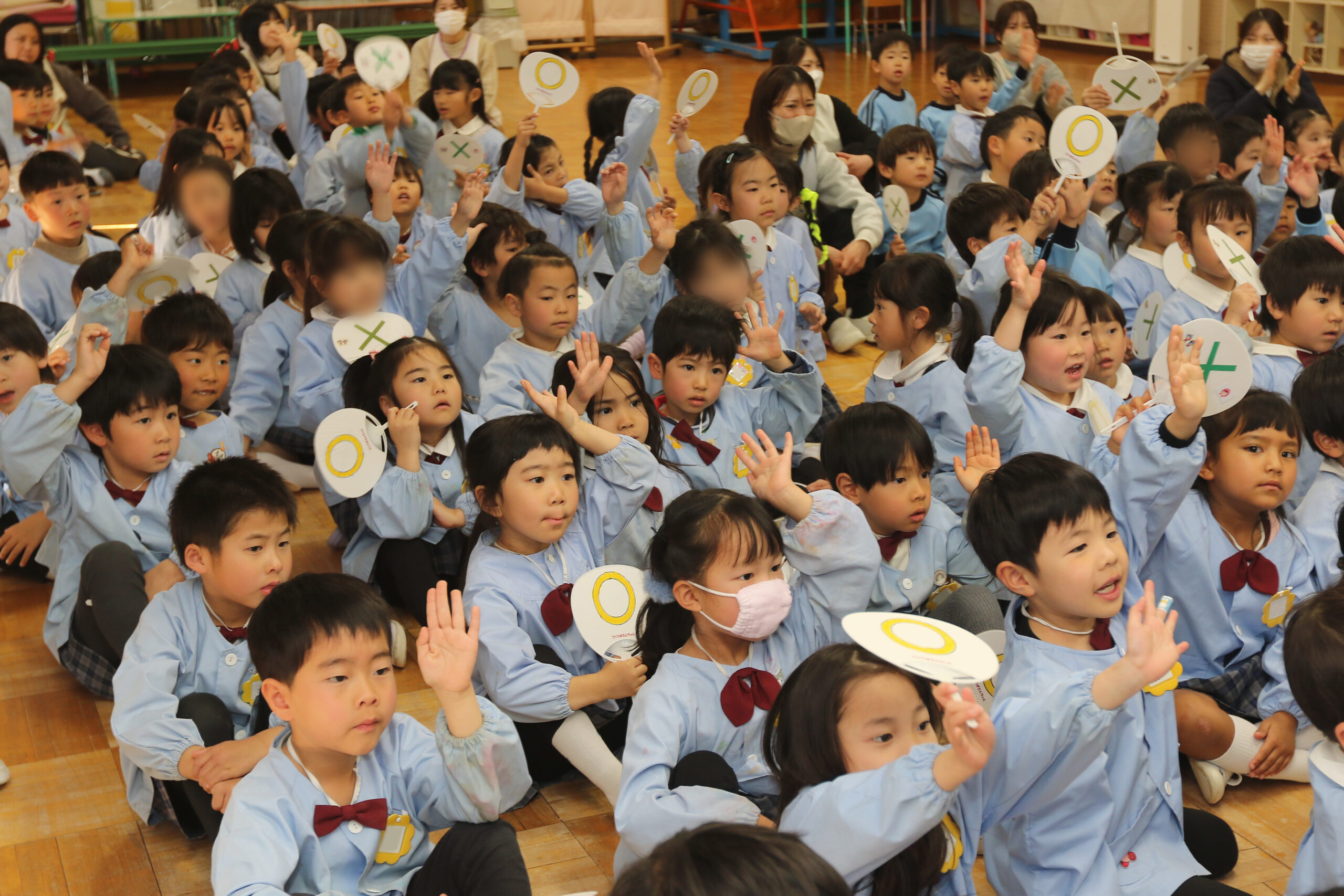 〇×クイズは「消防車や救急車を呼ぶ時は119番に電話する」「やけどをしたのですぐ水で冷やした」「火事を見つけた。火が小さかったので子どもたちで火を消した」など10問を出題。園児は正解すると手を挙げて喜んでいました。