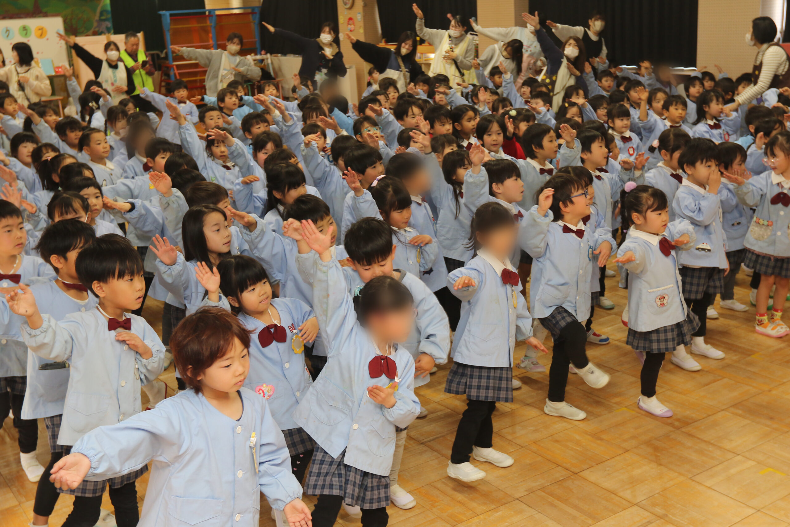 四日市市の富田文化幼稚園(中村紘也園長)で18日、園児約200人がクイズや踊りで災害から身を守る方法を教わりました。