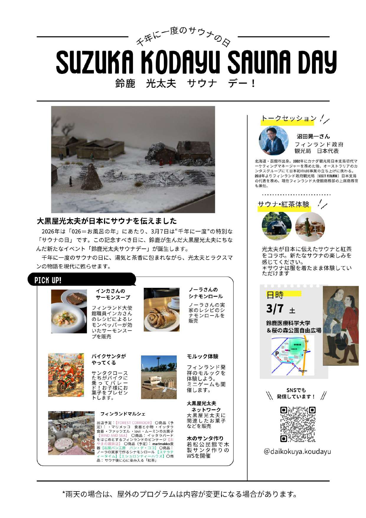 2026/02/2726/02/27 整うの起源は光太夫 SUZUKA KODAYU SAUNA DAY 3月7日 鈴鹿医療科学大学白子キャンパス