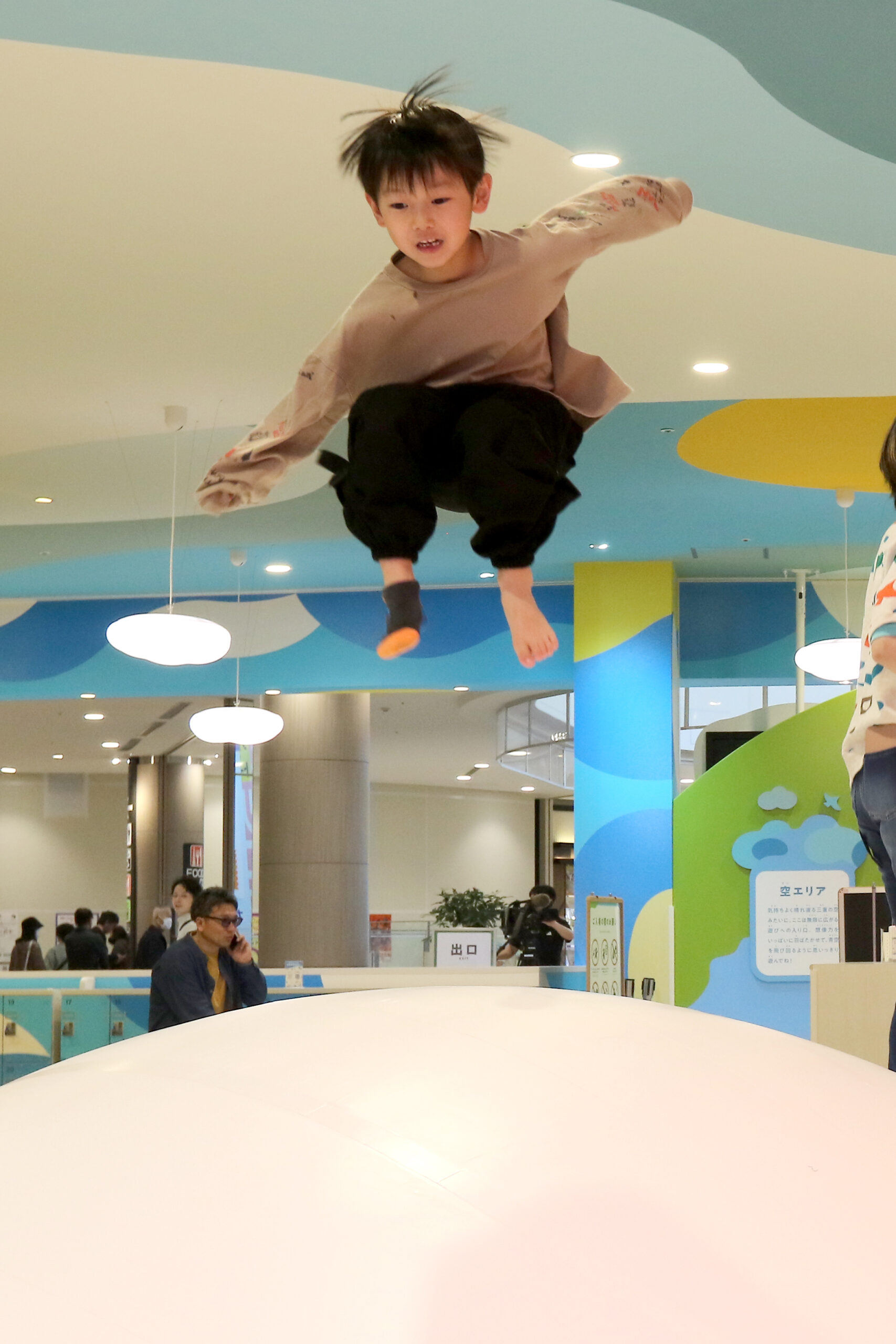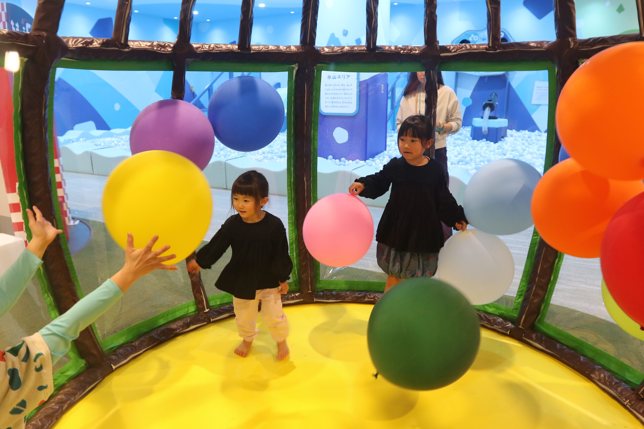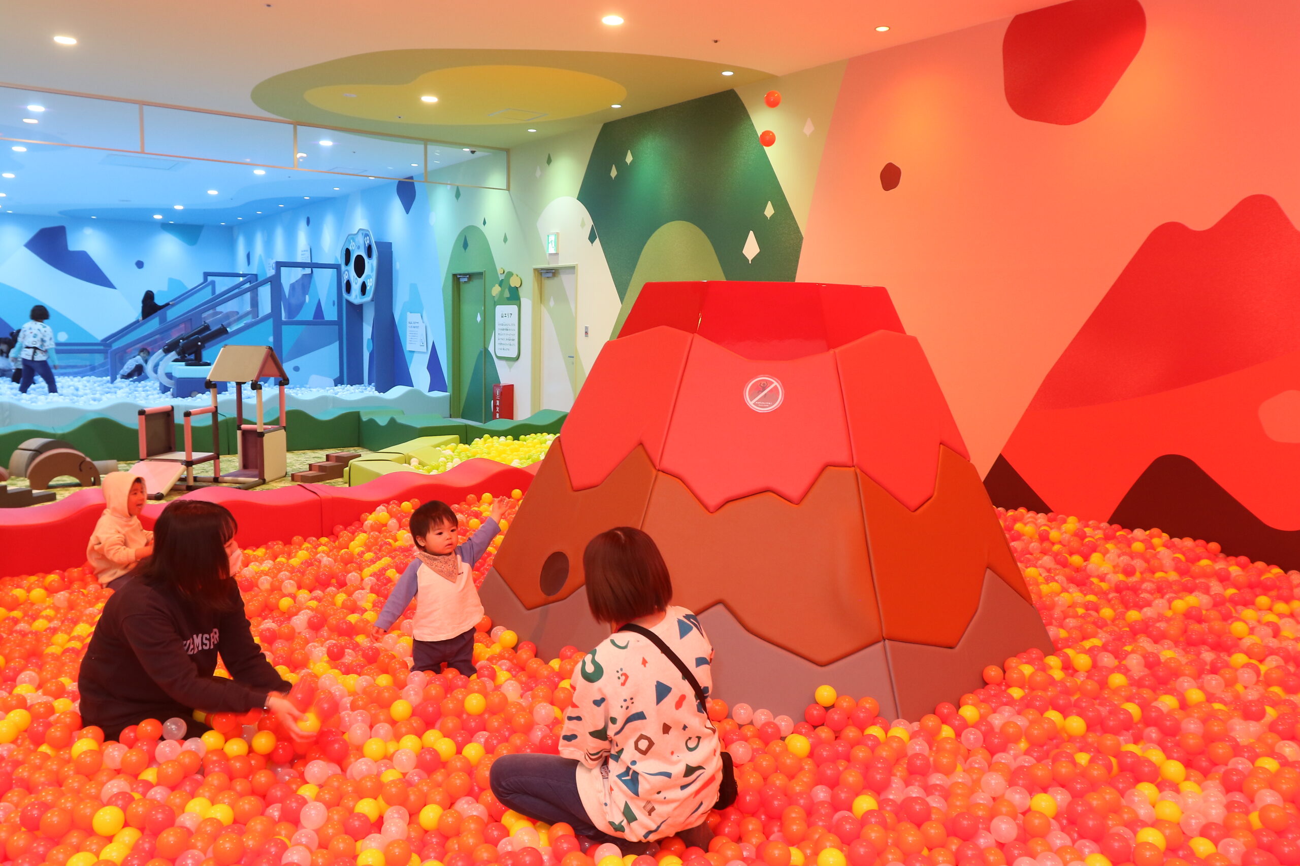 「氷山」「火山」「地層」「都市」などをモチーフにした8つのエリアは、飛び跳ねて楽しめる北極の氷をイメージしたふわふわドーム、マグマが噴火する火山をイメージし、球が飛び出すボールプール、地層エリアは安心の抗菌砂に触れる感覚を楽しめる砂場があり、着替え用の胴長ズボン、靴も用意されています。