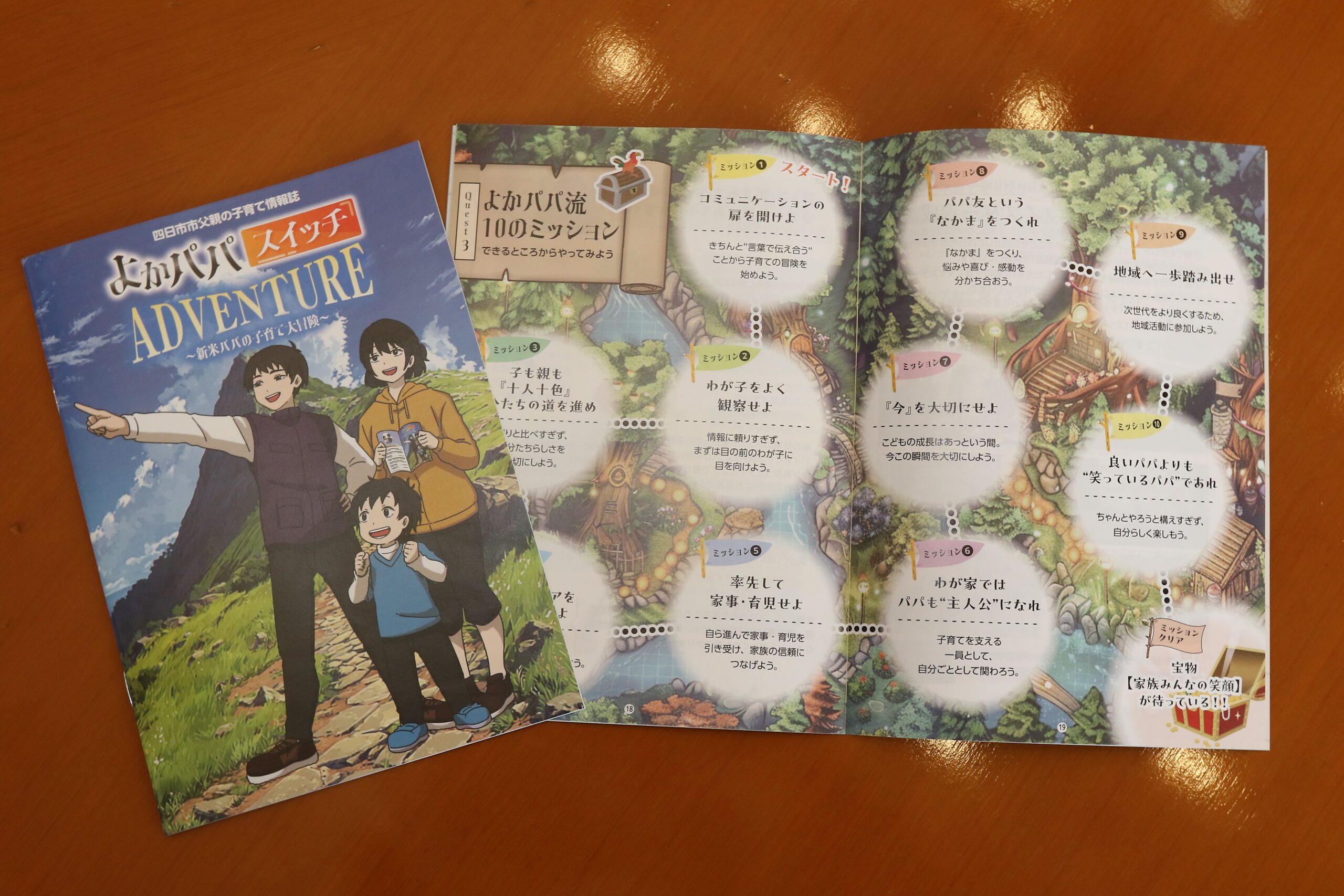 父親の子育てサークル、パパスマイル四日市(小島和人代表)が制作した情報誌『よかパパスイッチアドベンチャー』が完成、14日、四日市市役所で披露されました。